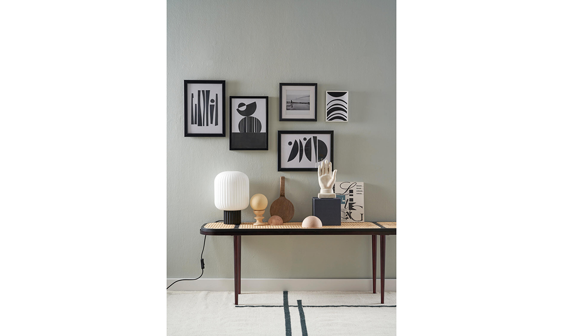 Panchetta in paglia di Vienna [101 Copenhagen, da Arcarreda]. Mano decorativa e candelabro [PalermoUno], sfere in legno [Leroy Merlin], racchetta vintage [Emporio Mikica]. Tappeto Ferm Living e lampada Lolly Broste Copenhagen