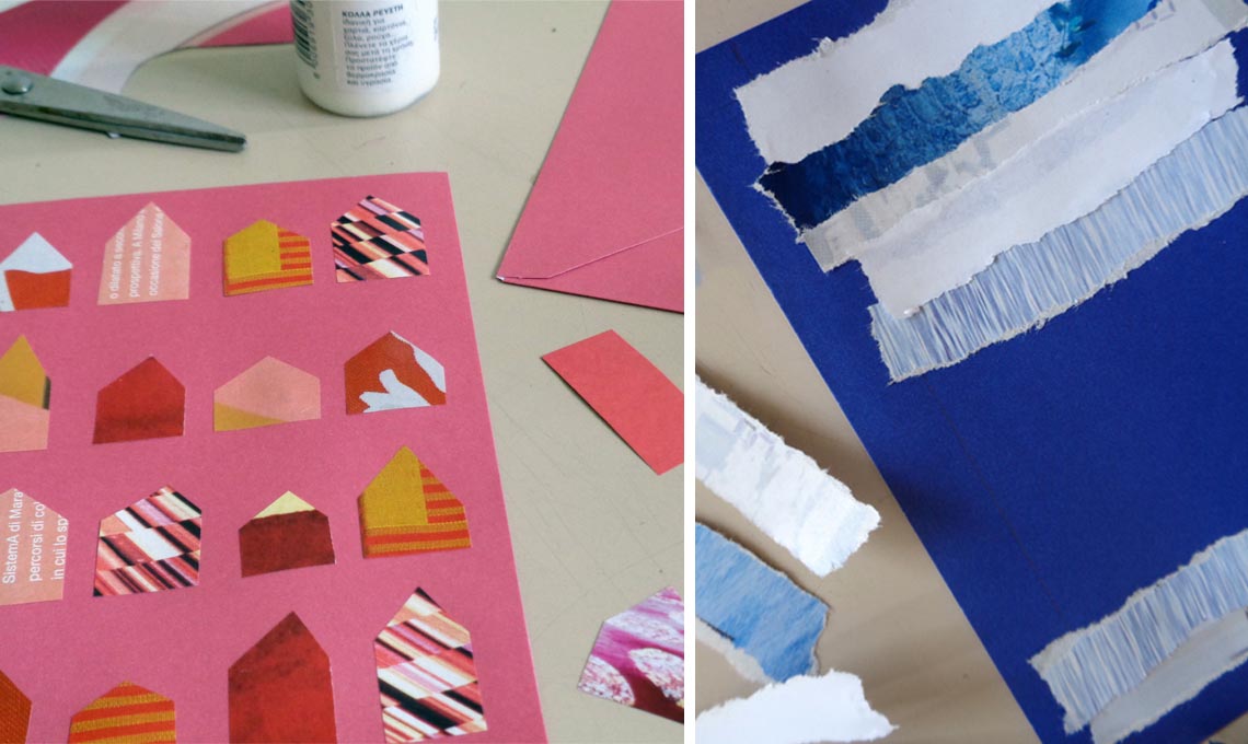 4. Per il biglietto astratto, strappa strisce sottili dalla pagina, incollandole una vicino all’altra cercando di esaltare i segni degli strappi e distribuendo i colori armonicamente.