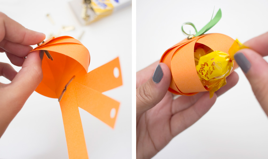 - Inserisci un nuovo fermacampione nel secondo foro delle strisce di carta. Curva le strisce e separale una dall’altra per formare il classico aspetto della zucca