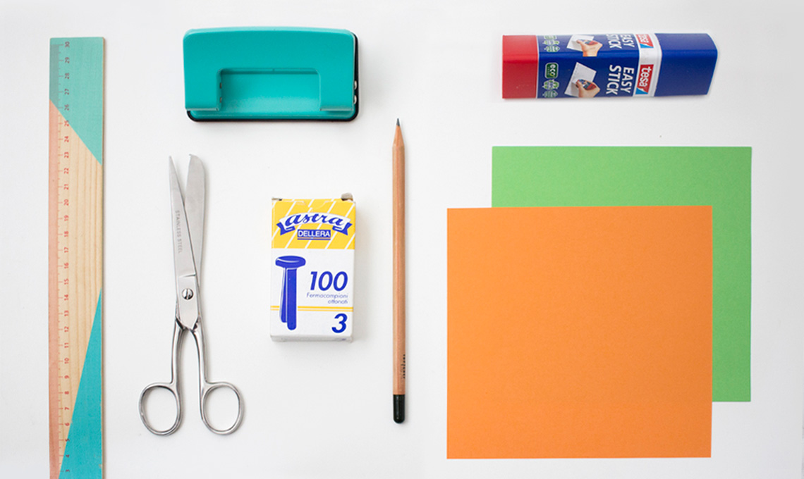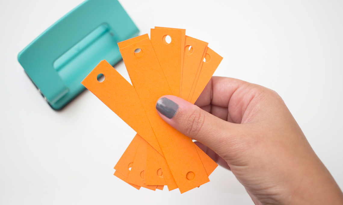 - Utilizzando la perforatrice, fai due fori sulle estremità delle 10 strisce di carta. Fai combaciare uno dei due fori delle strisce sovrapponendole una sull’altra.