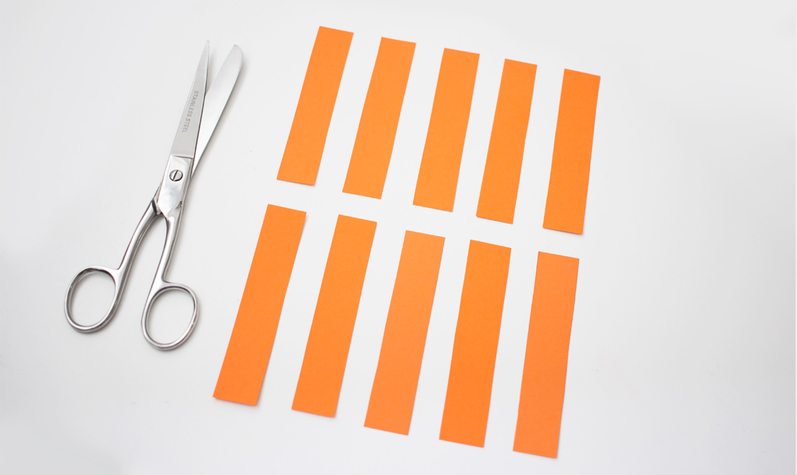 - Creare 10 strisce sulla carta arancione lunghe 10cm x 2cm e ritagliarle con le forbici