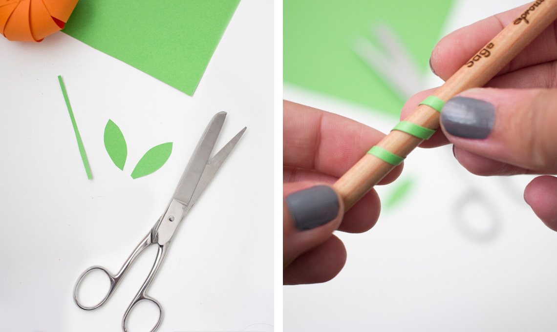 - Taglia una striscia sottile 3mm dal foglio di carta verde e arrotolalo intorno alla matita per creare il picciolo della zucca
