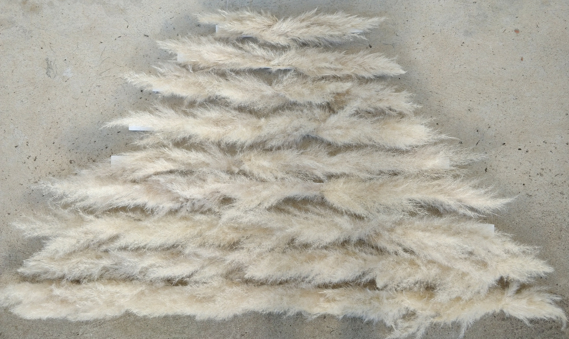 Staccate dei ciuffi dalle piume della Pampas e incollateli con la colla a caldo tenendo un verso fino a metà per poi cambiare fino al lato opposto in modo da iniziare e terminare ogni barra con le punte dei ciuffi. Ricoprite tutti i listelli con questo procedimento.