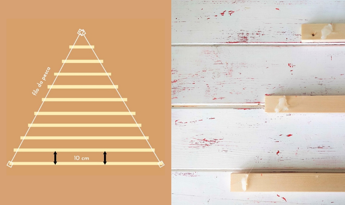Partite iniziando a costruire la struttura del vostro albero da appendere. Una volta decisa la distanza da tenere tra un listello e l’altro (io consiglio circa 10 cm) partendo dalla stecca più lunga, unite e fissate con la colla a caldo, il filo da pesca a tutti i listelli.
