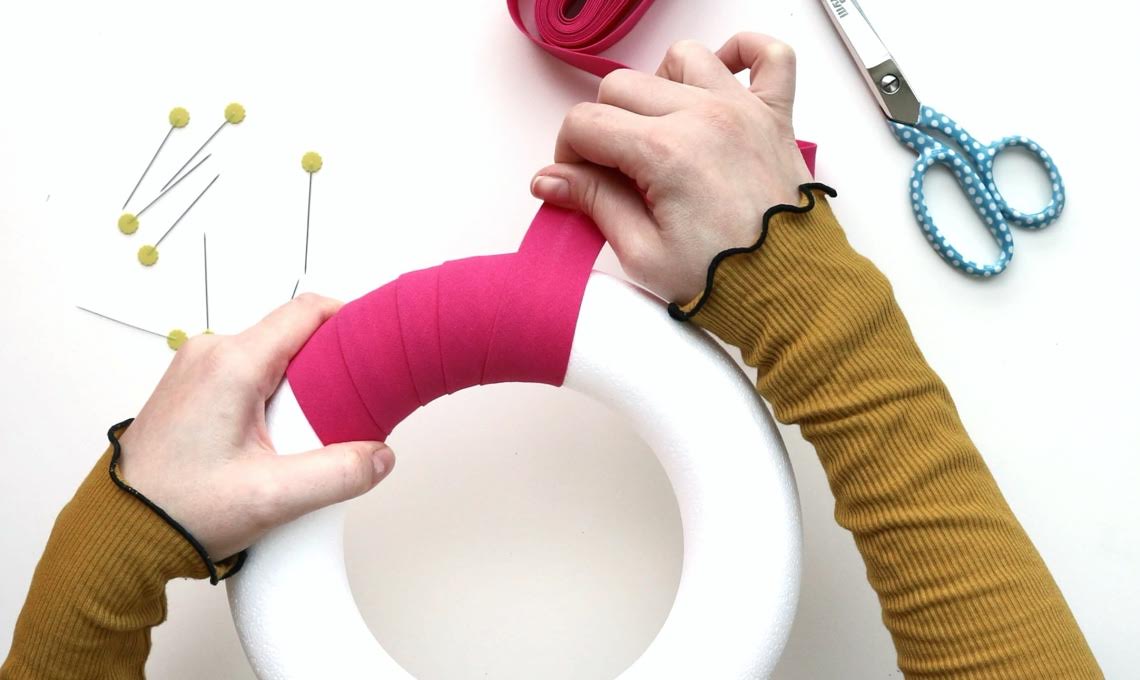 - Avvolgi il nastro sbieco attorno alla ciambella di polistirolo in modo da non lasciare spazi scoperti.