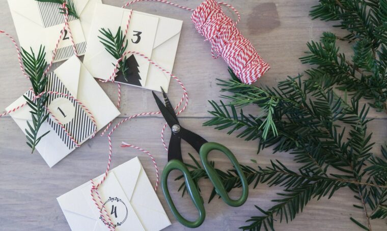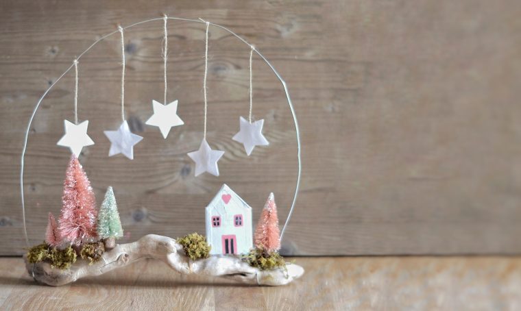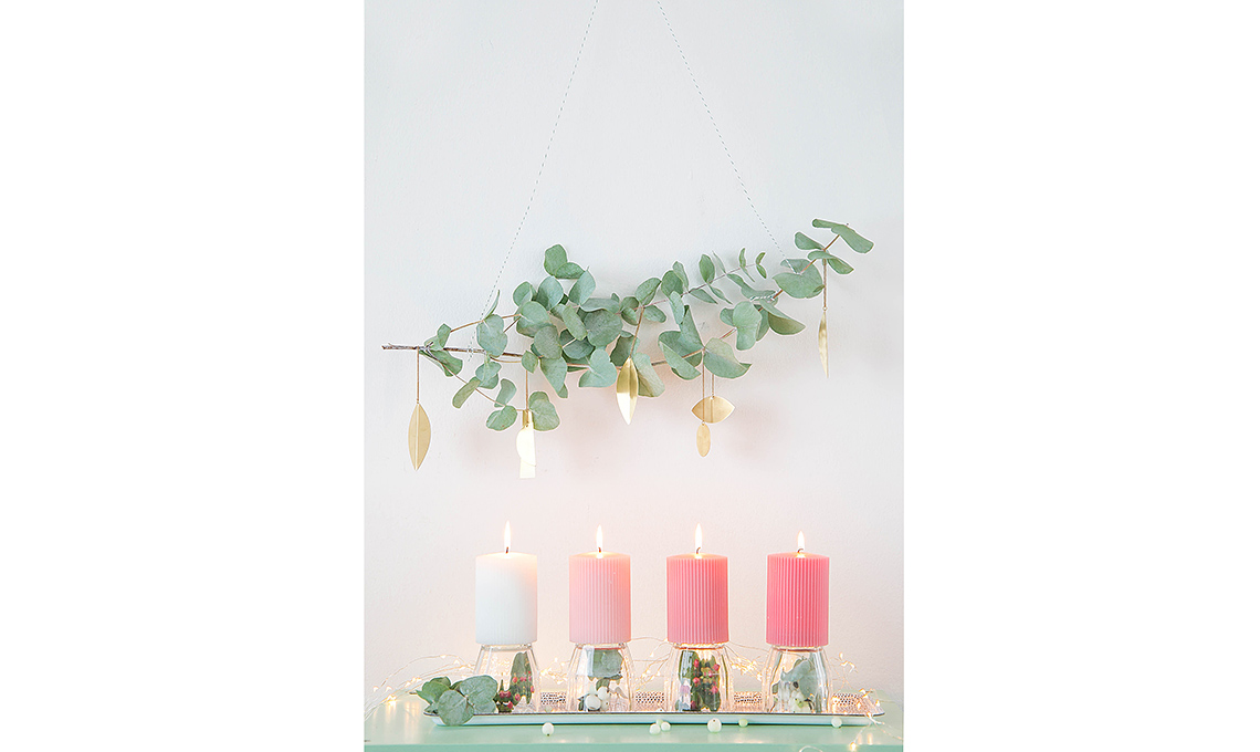 Taglia circa 80 cm di spago e legalo alle due estremità del ramo di eucalipto. Appendi il ramo e posiziona le decorazioni.
