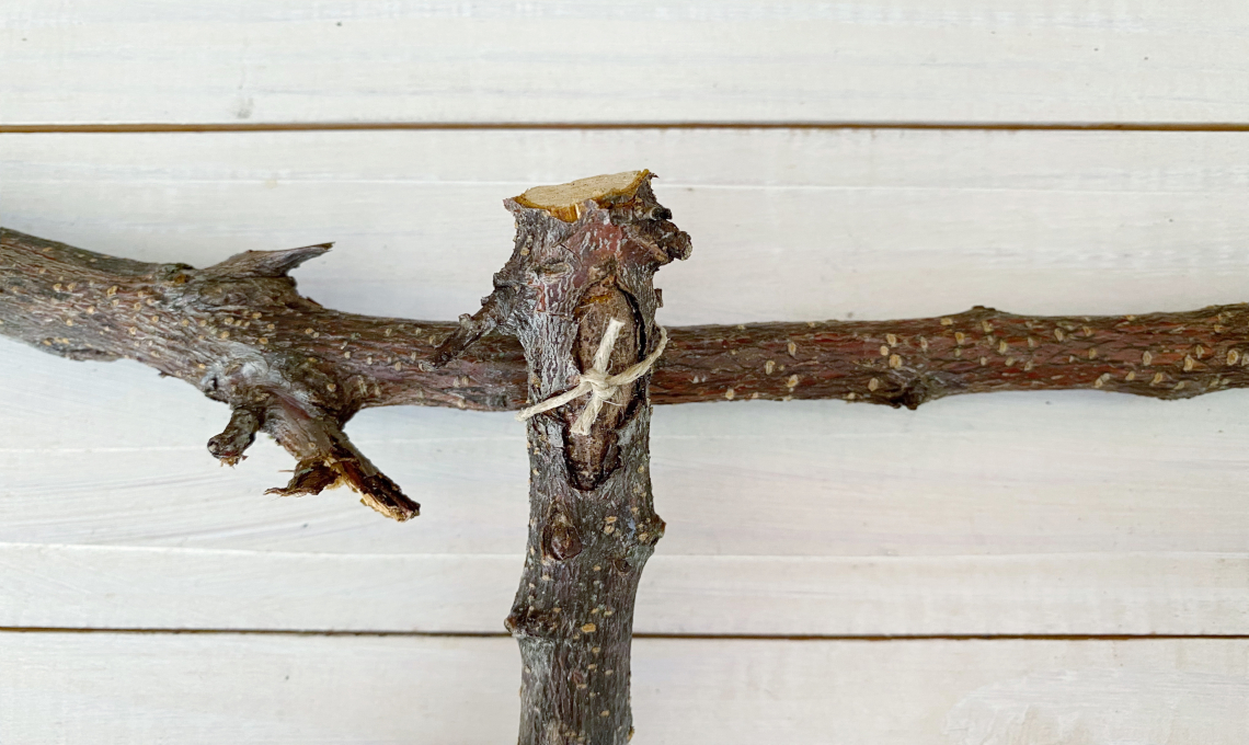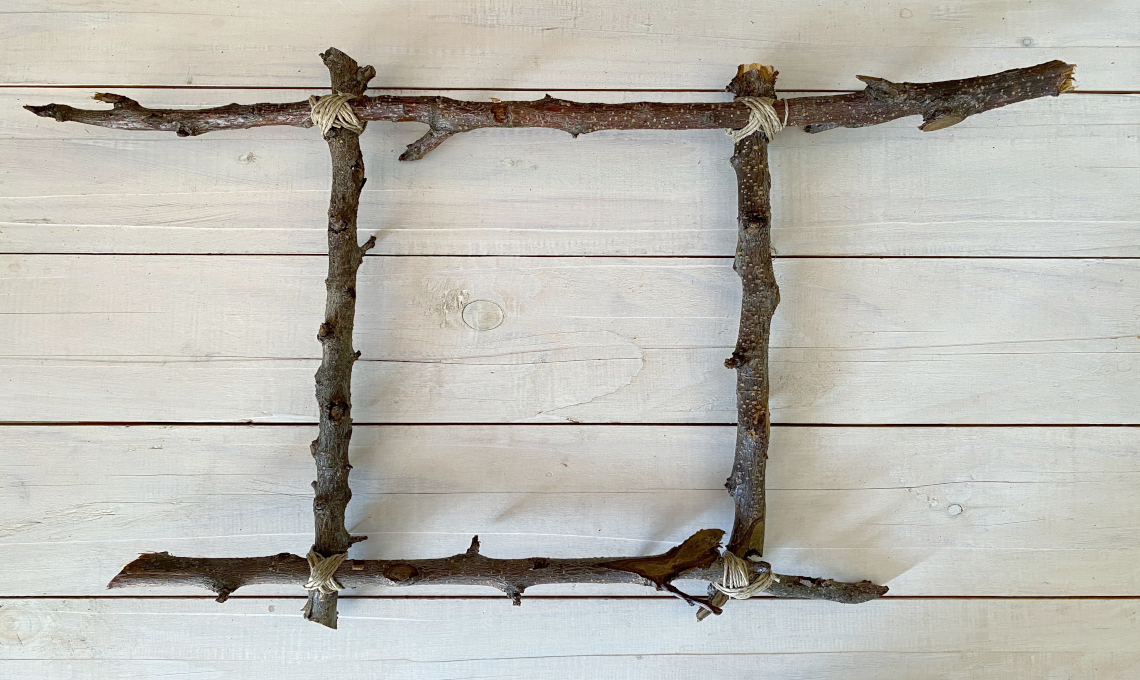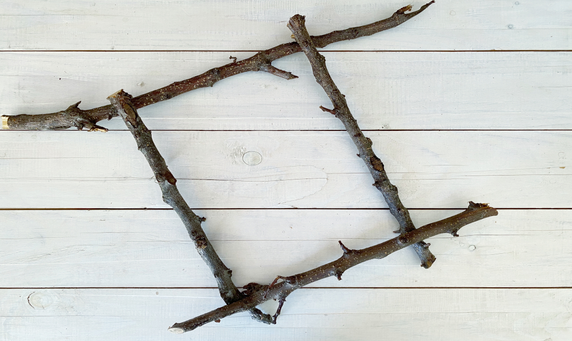 Ti serviranno rametti di legno che puoi recuperare durante una passeggiata nel parco, cordino color ecrù (ma puoi usare anche lana o cotone colorato) e forbici.