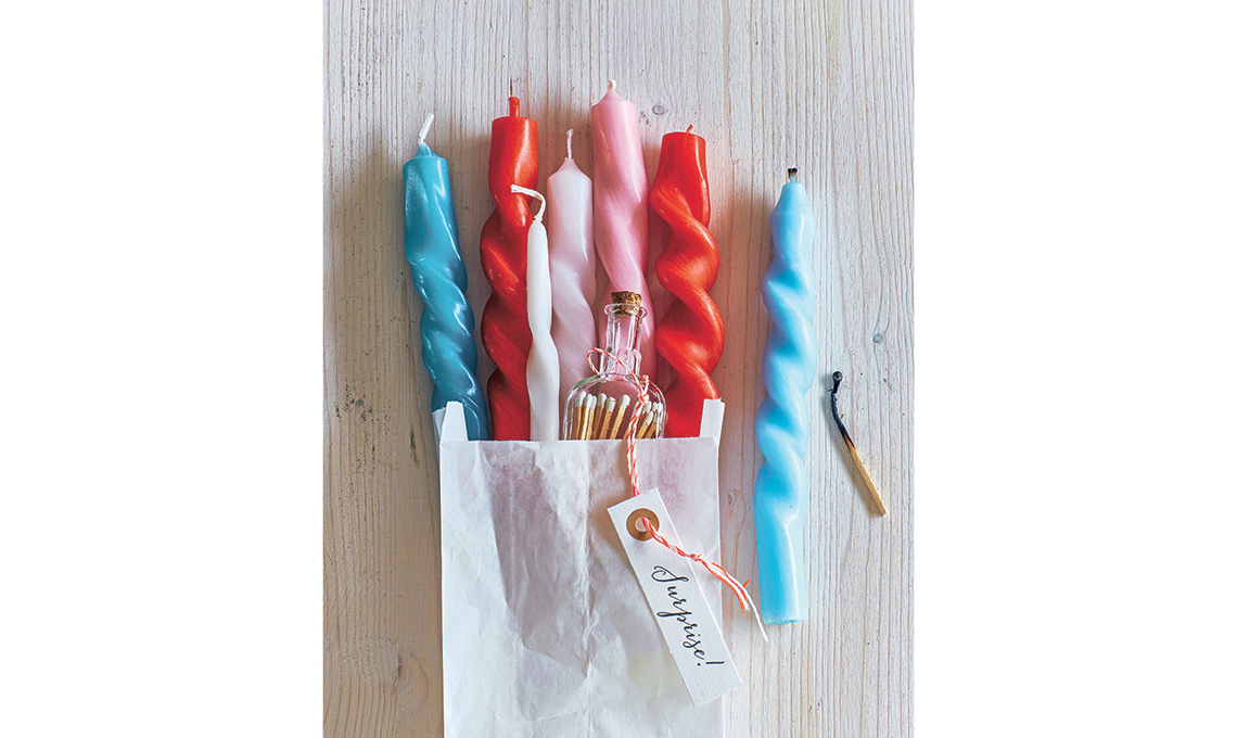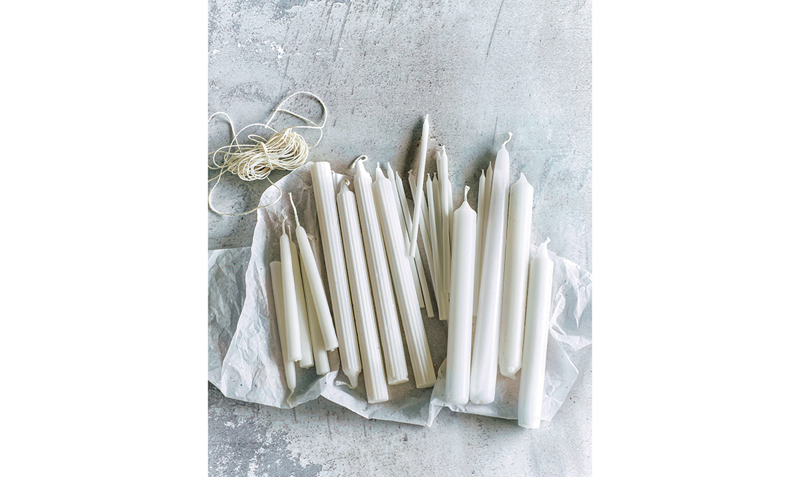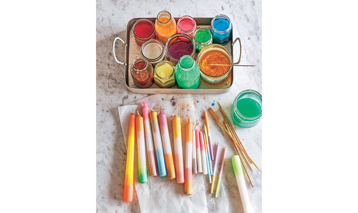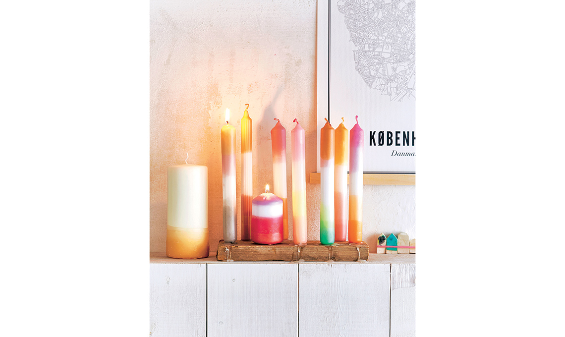Personalizza le candele di cera tinta unita con righe, pois, fiori e altri decori disegnati a mano libera. Usa i colori acrilici all’acqua specifici per candele [Rayher] – sono atossici e non scivolano sulla cera – o i pennarelli con cera liquida [Hobbyland].