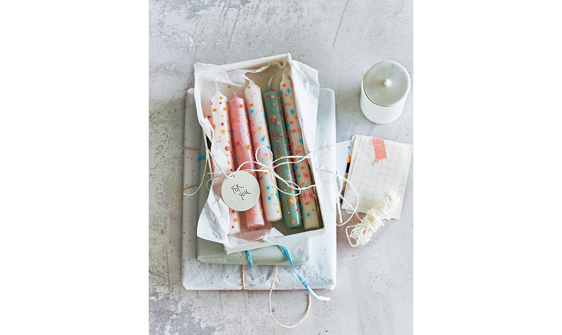 È l’idea décor super facile per personalizzare le tue candele con micro pattern 3D: sciogli a bagnomaria degli avanzi di candele colorate o alcune pastiglie di colorante – ti servono poche quantità per colore. Immergi la punta di uno spiedino di legno nella cera sciolta e disegna un piccolo pois sulla candela. Alterna i colori. Se hai mani più esperte cimentati in fiorellini o altri motivi micro. Se decidi di non usarle subito, avvolgi le candele nella carta velina: ricorda che sono molto fragili.