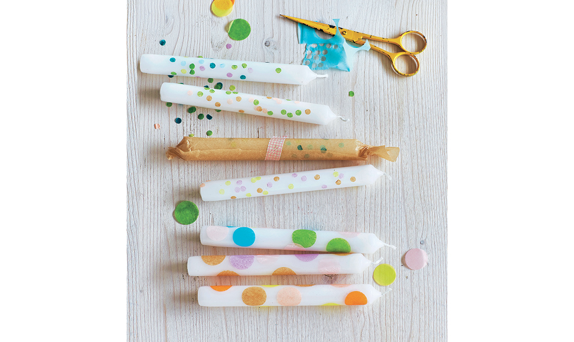 Occorrente: candele bianche, carta velina colorata, fustelle a cerchio, forbici, carta forno, asciugacapelli. Come si fa: con le fustelle ritaglia dalla carta velina colorata tanti pois – sovrapponi più fogli e il taglio risulterà più preciso e veloce. Distribuisci i pois sulla carta forno, avvolgi la candela e fissala con il nastro adesivo. Scalda la candela con l’asciugacapelli, fino a quando i pois di carta, in trasparenza, risulteranno più scuri. Significa che si sono fusi con la cera. Non sostare troppo a lungo in un punto, per evitare di sciogliere la cera.