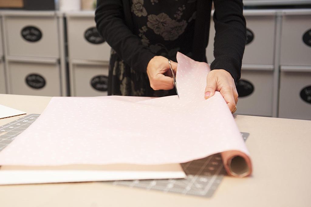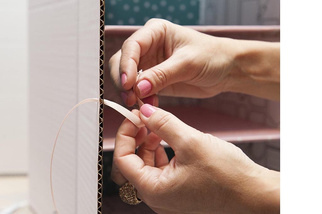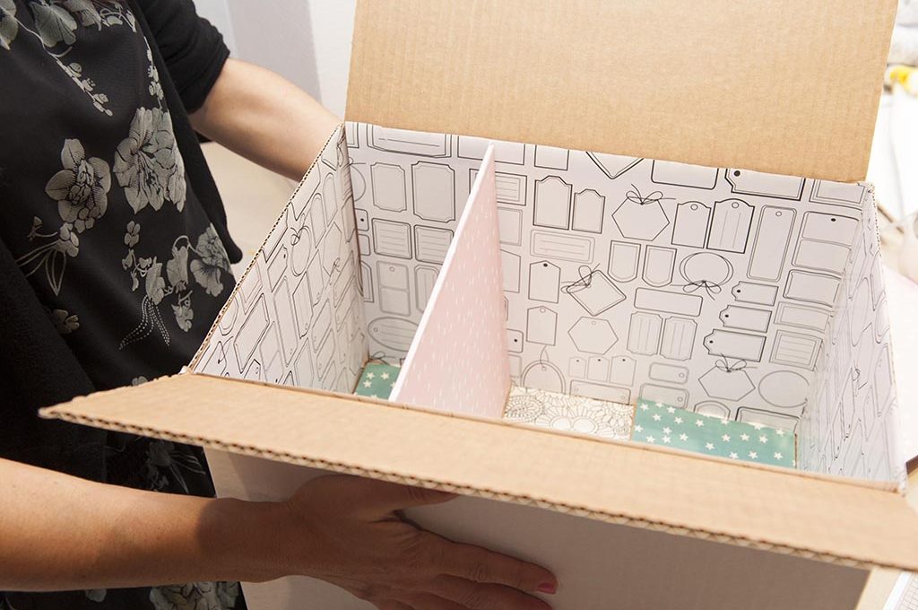 Rivesti i ripiani e la seconda scatola con la carta colorata