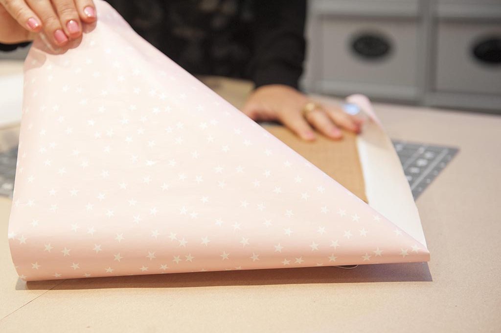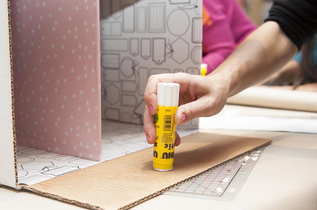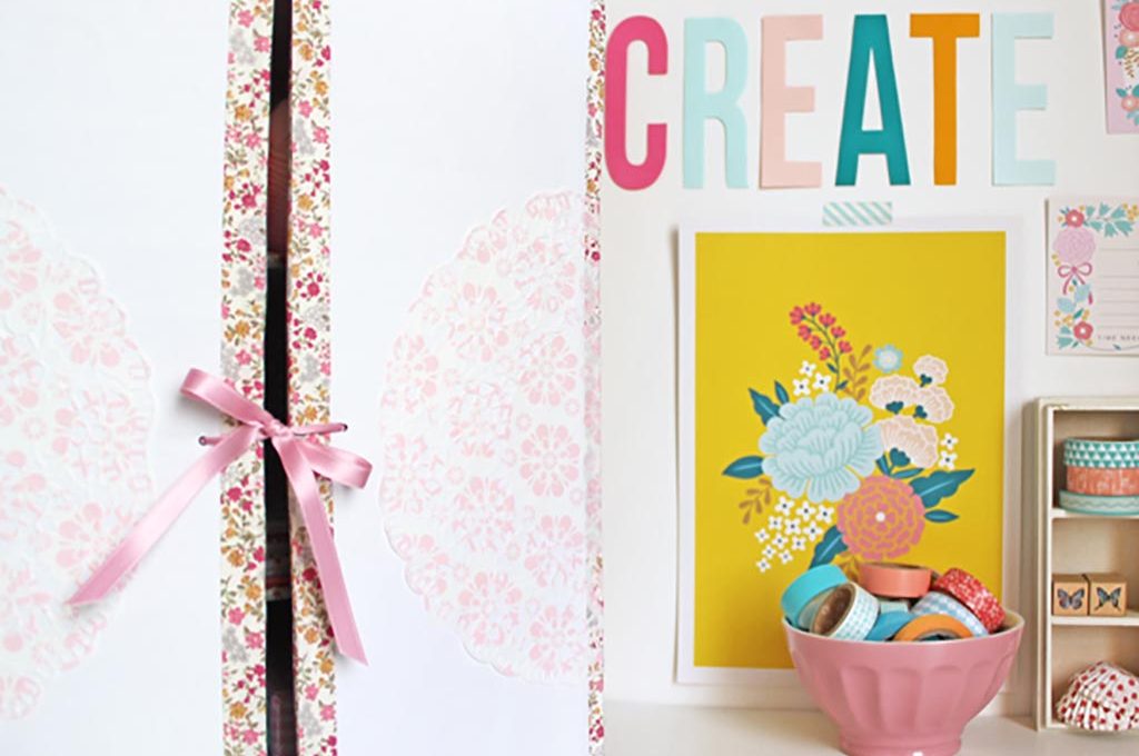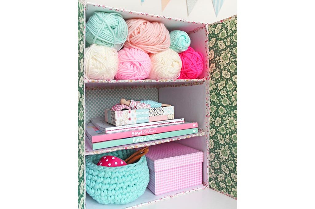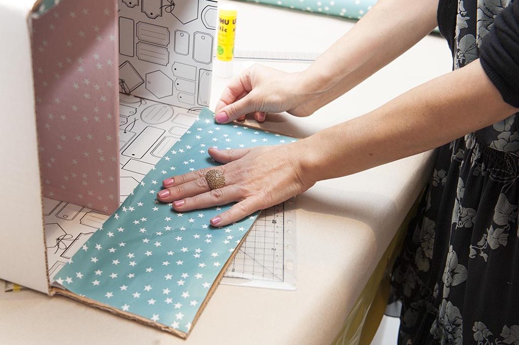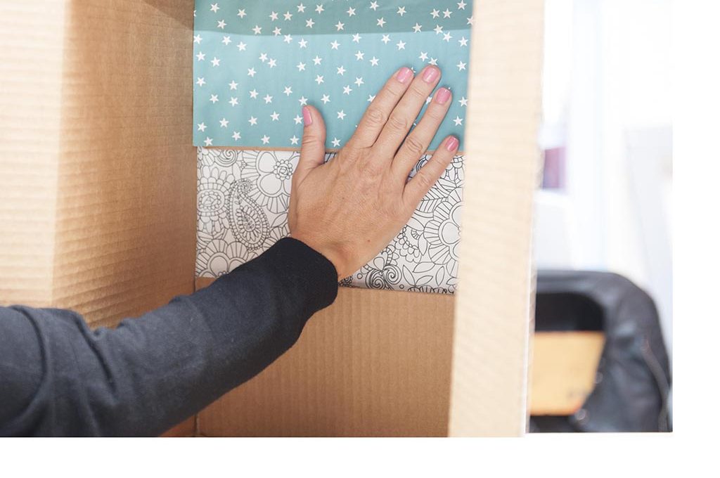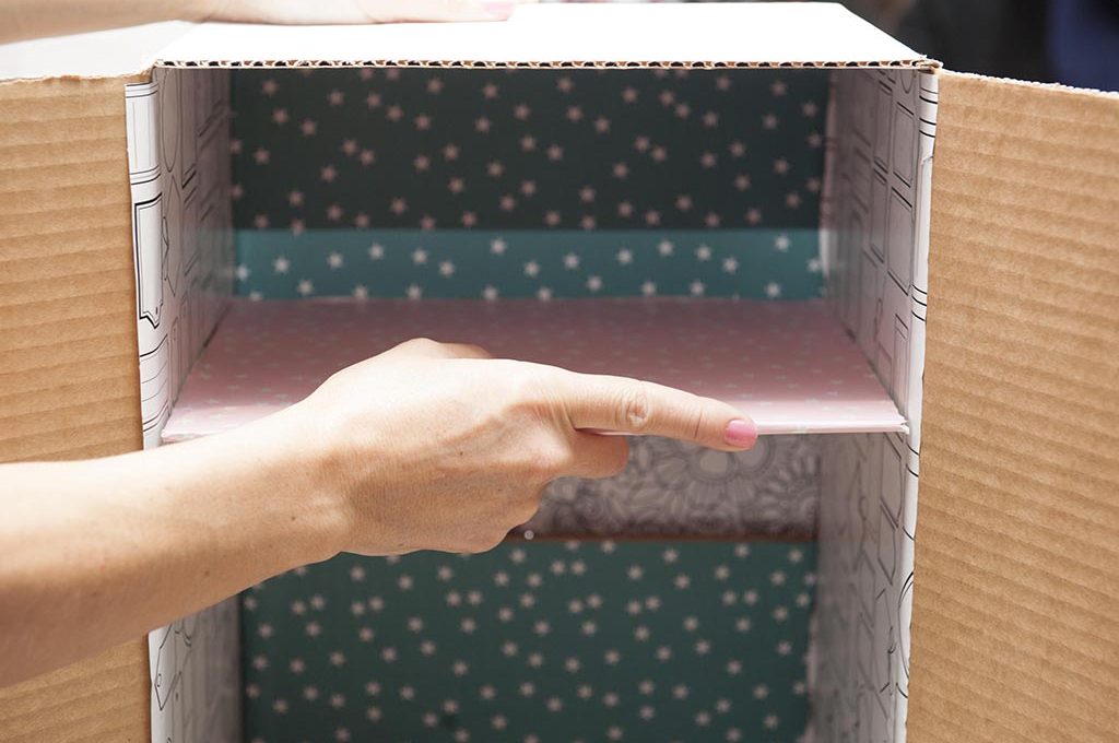 Una semplice scatola di cartone si trasforma in un piccolo armadietto con della semplice carta colorata