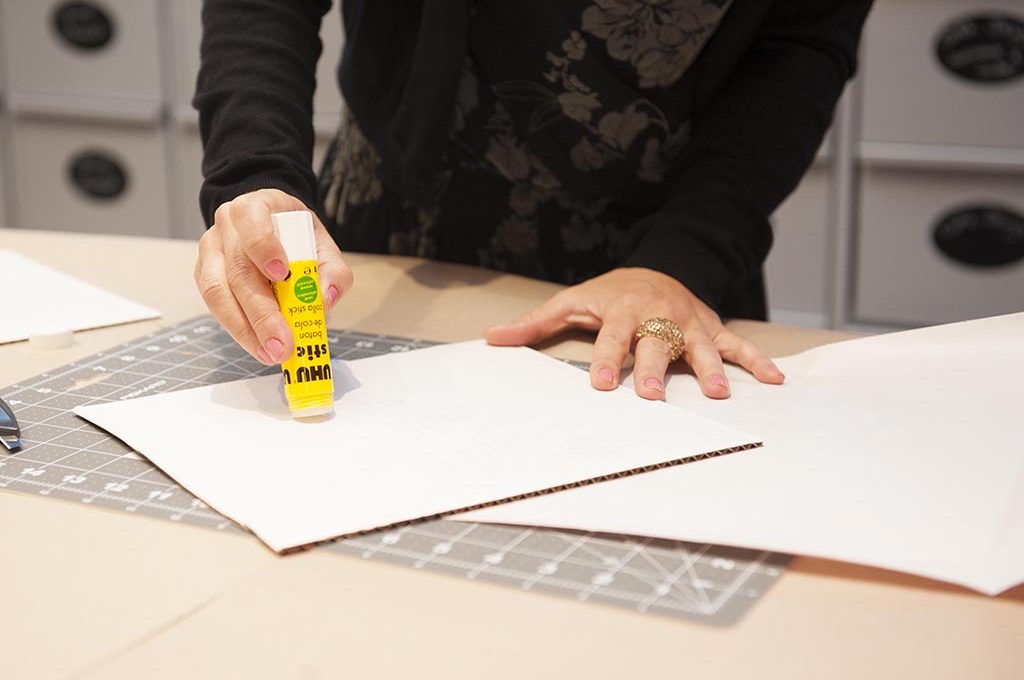 Con la colla 'forte' in tubetto incolla i lati dei 'ripiani' e posizionali all'interno della scatola tenendo premuto per qualche istante