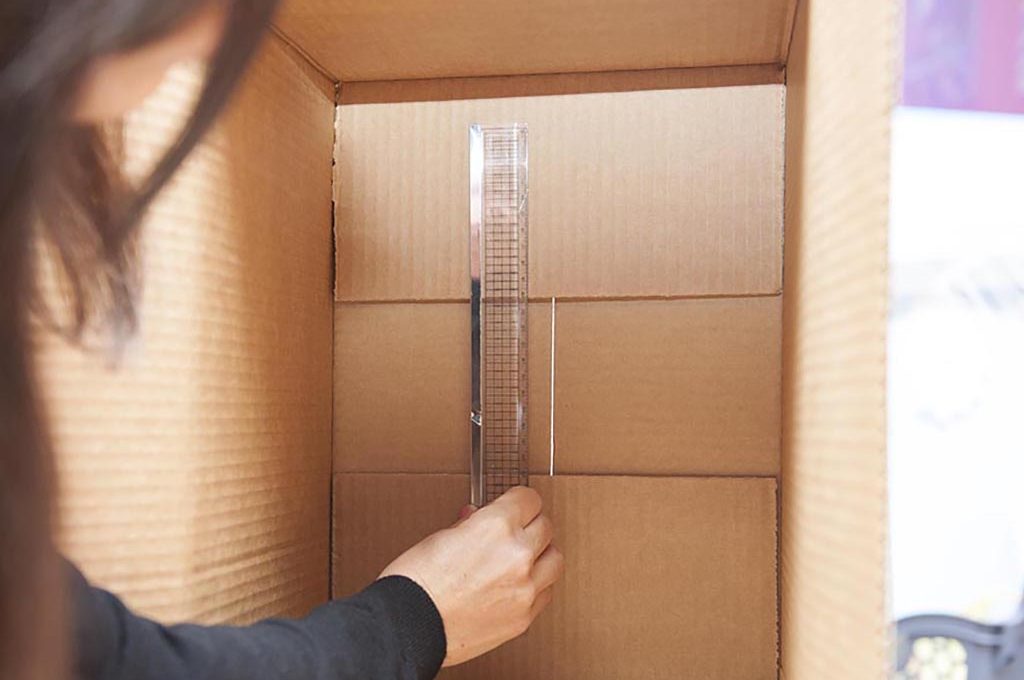 Ritaglia dalla prima scatola tre rettangoli di cartone della stessa larghezza e profondità della seconda scatola, saranno i 'ripiani'