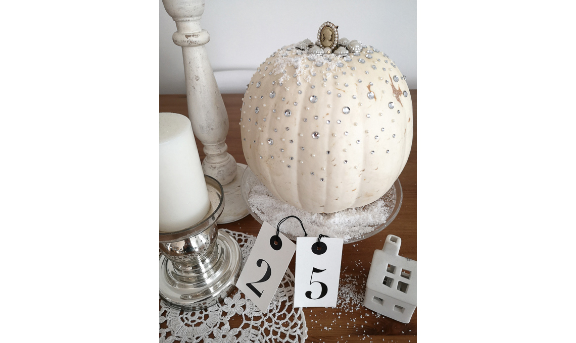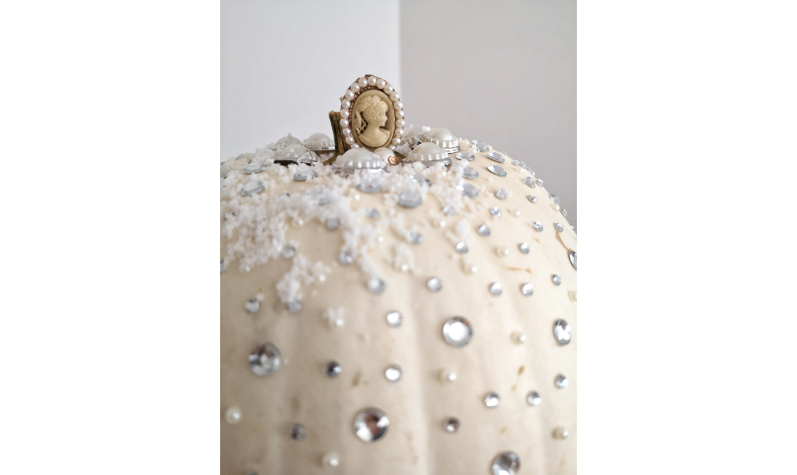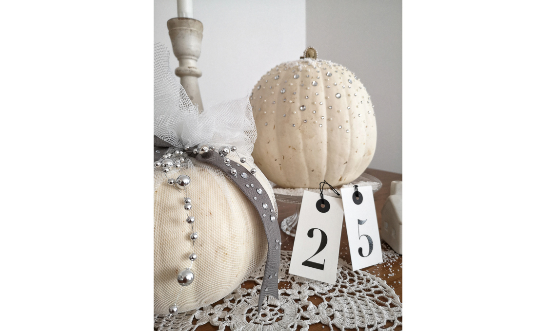 - Puoi dilettarti a renderla romantica usando perline e glitter. Li trovi nei negozi di fai da te o online e di solito sono già preincollati. Una cascata di piccole sfere luminose che renderà sontuosa anche una semplice zucca che ora è pronta per traghettare l’autunno verso la più scintillante delle feste. Se la tua zucca è già bianca ti consiglio di non colorarla. L’effetto romantico e un po’ antico è più bello con i colori naturali.