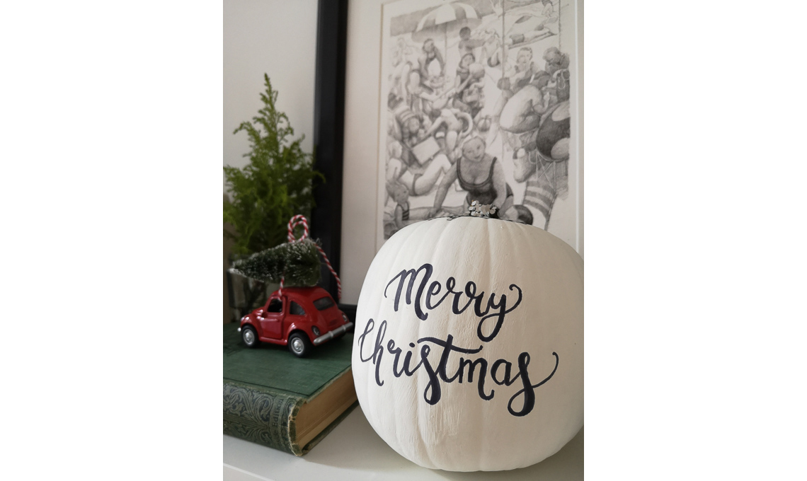 - La puoi dipingere completamente di bianco. Usando poi una bella calligrafia scrivici il più classico dei messaggi, Merry Christmas. Con la colla attacca al picciolo dei glitter. La zucca ora è perfetta per accogliere chi entra in casa o per essere usata come centrotavola in puro stile nordico.