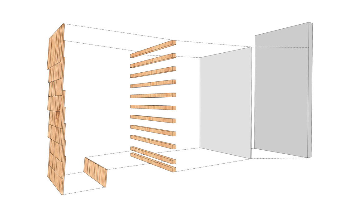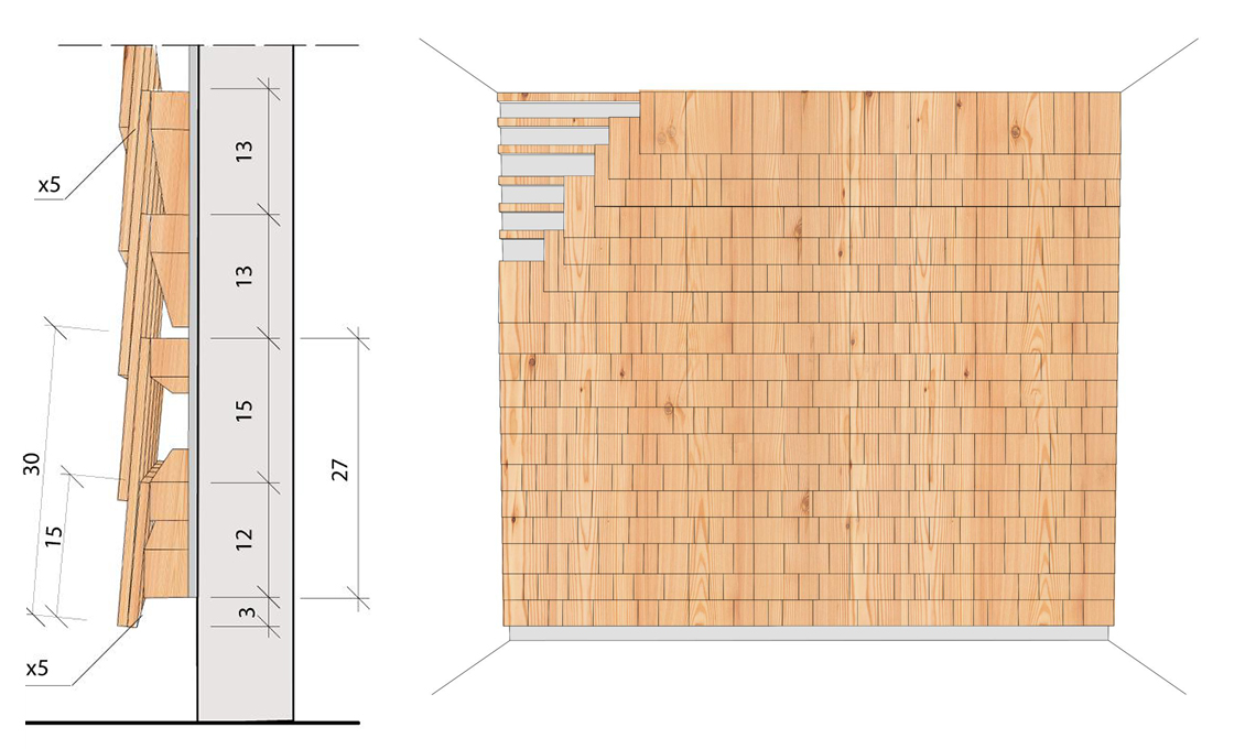 Componi la griglia con i listelli (C): dividi l’altezza della parete con la parte da lasciare a vista della scandola. Esempio: la parete è alta 300 cm, hai scandole da 30 cm e sovrapponendole vuoi lasciare visibili 13 cm? Calcola 300 : 13=23 listelli a 13 cm tra loro.