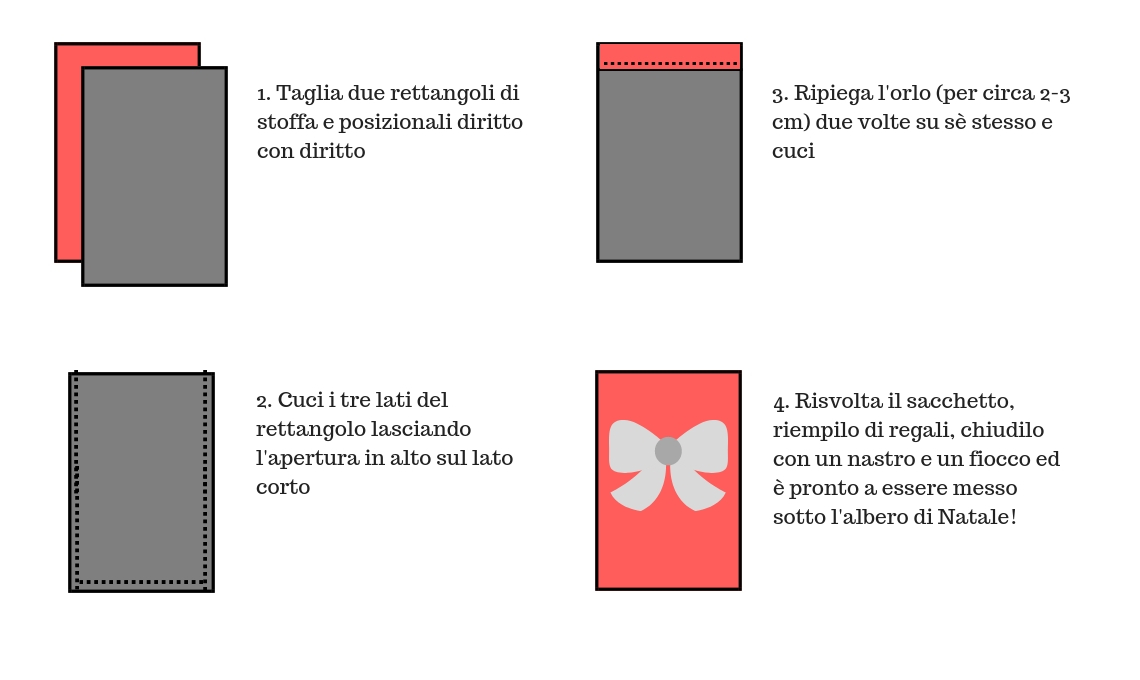 Ogni anno il solito problema: come impacchettare i regali, cercando di rendere la confezione originale? Quest’anno lascia da parte la carta e prendi delle belle stoffe colorate. Seguendo pochi passaggi potrai realizzare un pratico sacchetto, che potrà essere riutilizzato da chi l’ha ricevuto. In questo modo anche la confezione sarà un vero e proprio regalo.