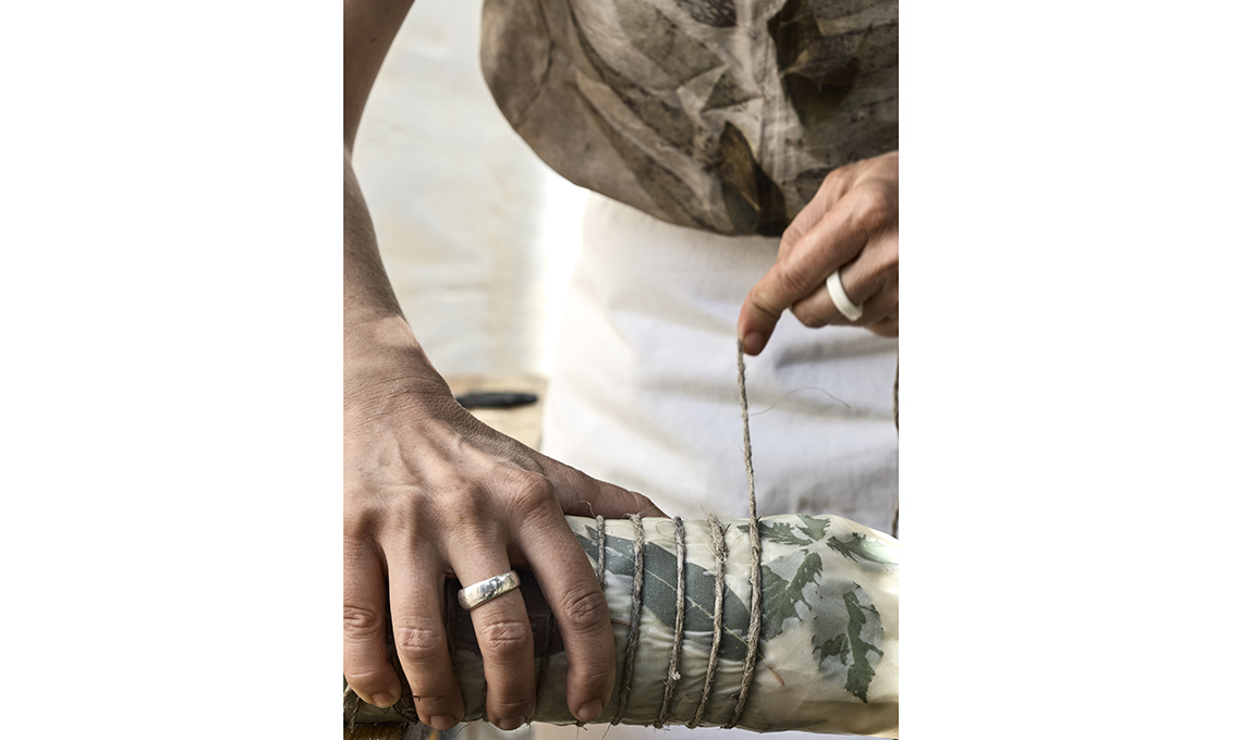 - Slega lo spago, srotola il tessuto, stendilo sul tavolo, aprilo e togli le foglie. Per fissare la stampa lava il tessuto in acqua fredda con poco ammorbidente per circa 5 minuti.