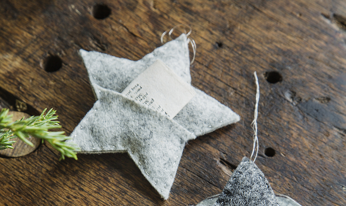 - Cucile tra loro a punto festone, lasciando un’apertura su un lato. Inserisci all’interno l’imbottitura, spingendola nelle punte. Cuci l’apertura. Con lo stesso filo realizza un’asola per appendere la stella.