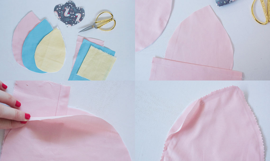 - Cucire lungo i bordi i tre strati, stando attenti che il rettangolo sbordi dai lati della goccia. Lasciare un buco su uno dei lati (meglio in una delle parti superiori della goccia).