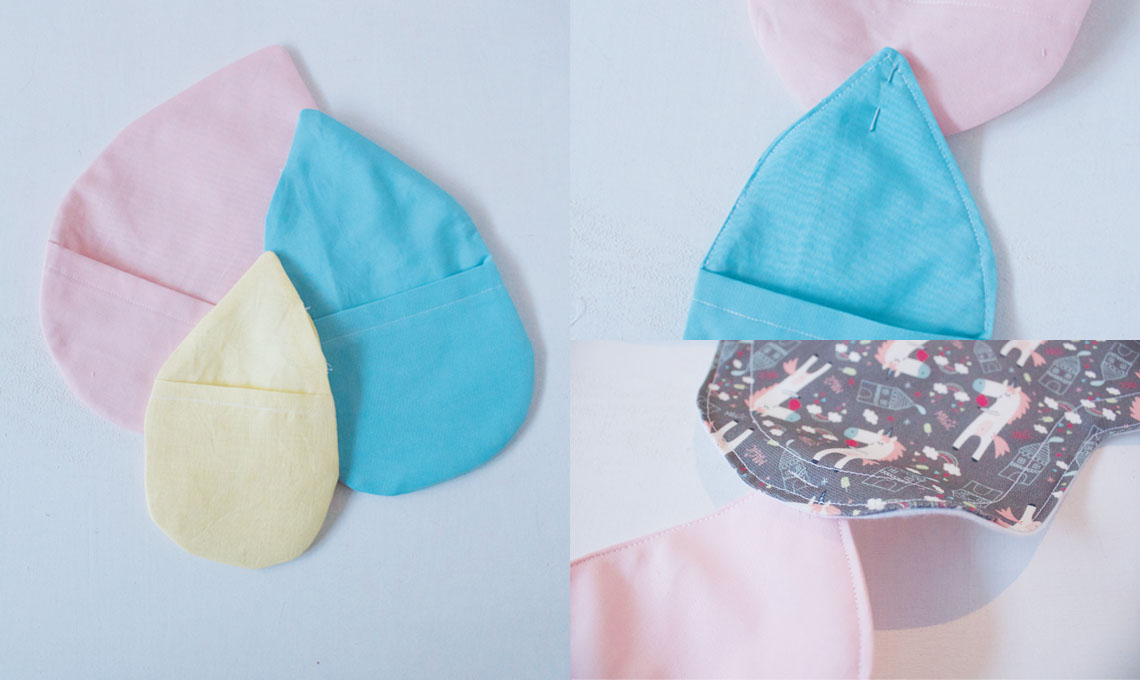 - Una volta ottenute le tre forme finite posizionarle in ordine dalla più grande alla più piccola fermando con un punto a macchina la punta di una goccia sulla tasca di quella superiore.
