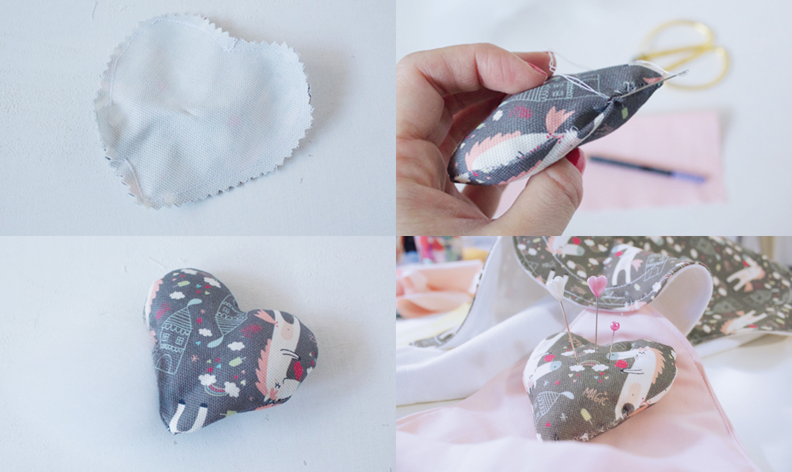 Per preparare il puntaspilli cuore appaiare le due sagome fantasia, dritto contro dritto, e cucirle lungo i bordi, lasciando una piccola apertura. Pulire il profilo con le forbici a zig zag, quindi rivoltare a dritto e imbottirlo. Chiudere il buco lasciato con un punto nascosto.