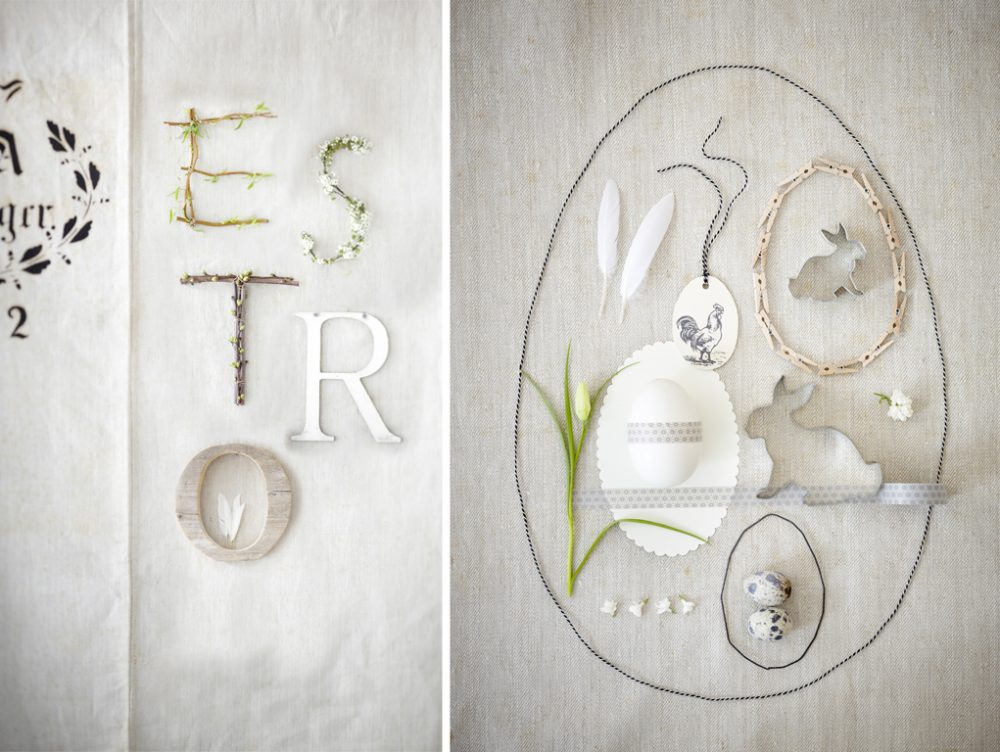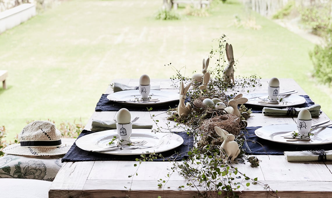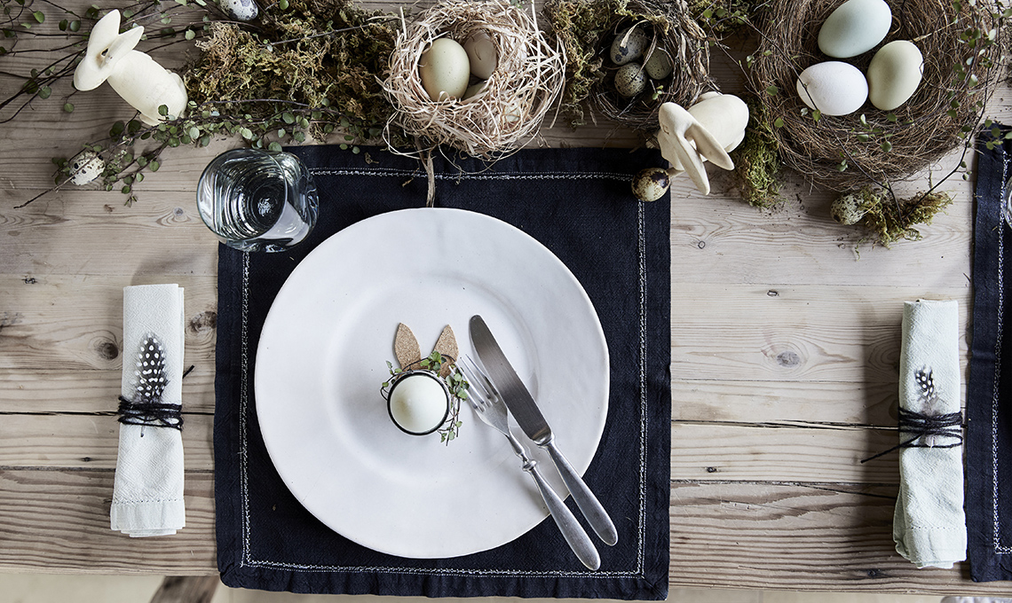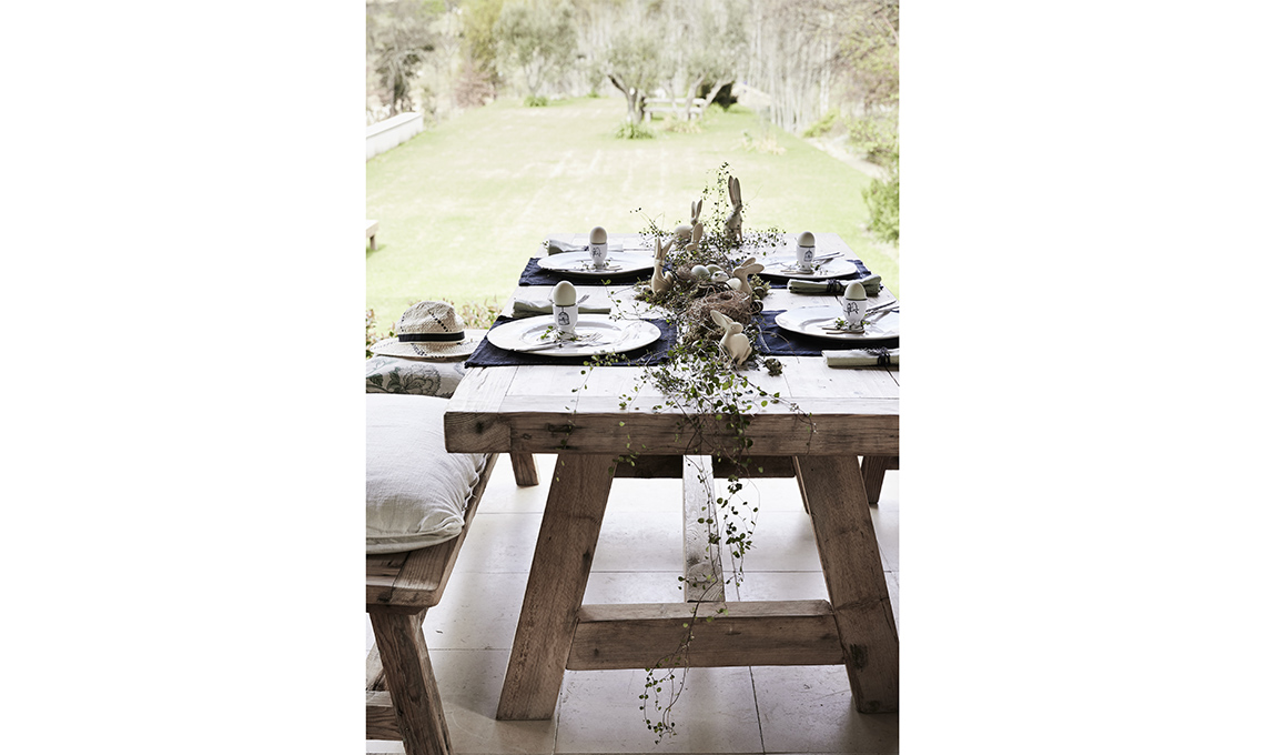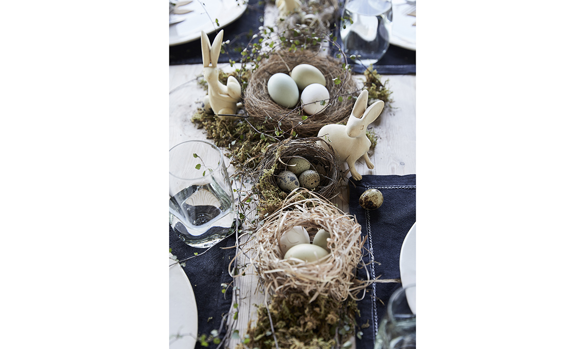 Look ‘nudo’ ad esempio per il tavolo di legno: invece della tovaglia, se vuoi uno stile più informale scegli le tovagliette americane di lino e divertiti a creare un bellissimo centrotavola con piante, fiori e rami. Se il tavolo è rettangolare realizza una composizione allungata che si snoda come un runner, se invece il tavolo è rotondo segui la geometria del tavolo anche per il centrotavola: nidi, uova, coniglietti di legno intagliato e rametti appena colti in giardino inneggiano alla Pasqua.