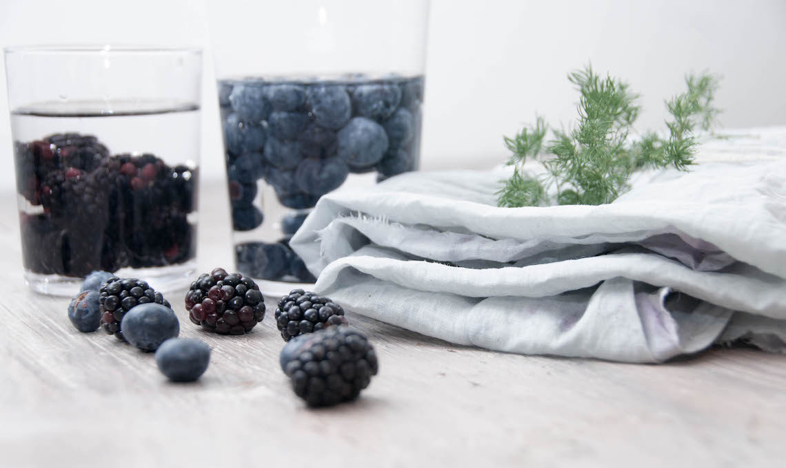 Per prima cosa il tessuto va preparato immergendolo in 16 parti di acqua e 1 di sale e portato a bollore per circa un’ora. Questo passaggio permetterà al colore di fissarsi meglio. Nel mentre si può preparare il colorante, tagliando i frutti a piccoli pezzi e coprendoli con acqua pari al doppio del loro volume. Anche in questo caso bisogna far bollire tutto per un’ora e poi lasciarlo raffreddare completamente. A questo punto possiamo immergere il tessuto nella tintura e farlo sobbollire per un’altra ora, o poco più se si vuole ottenere un colore più intenso.