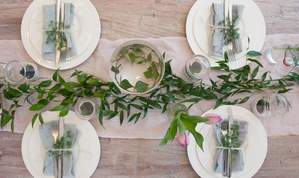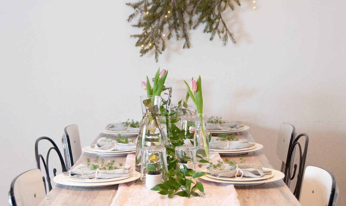 Il runner rosa al centro richiama i primi timidi tulipani di stagione e i tovaglioli, volutamente stropicciati e senza orlo, anticipano il dessert di frutti di bosco nascosto sotto il bicchiere.