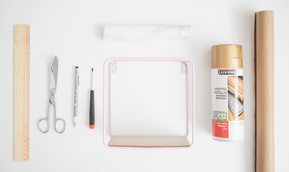 L’abbinamento oro e marmo contribuirà a rendere la mensola più elegante e raffinata, ma se l’accostamento non dovesse piacerti, potrai utilizzare diversi tipi di carta adesiva: dalle fantasie più particolari a quelle classiche effetto legno o pietra.