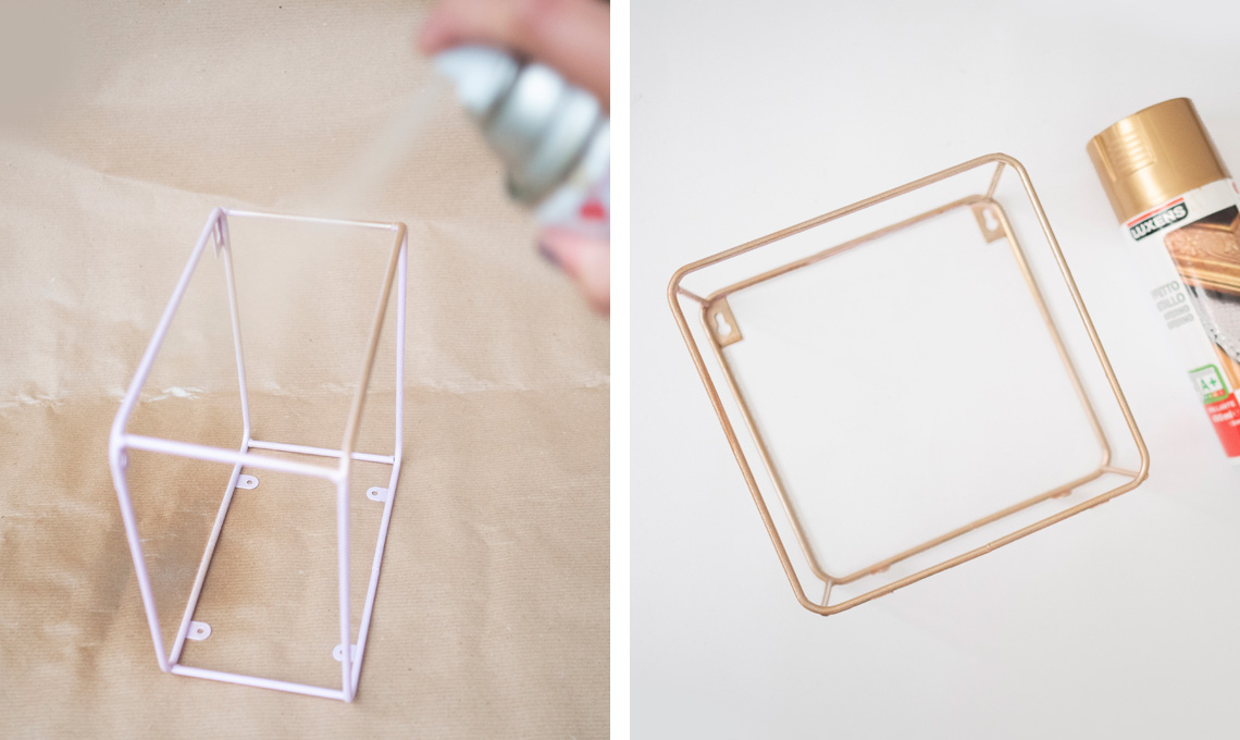 - Vernicia la struttura metallica con due mani di bomboletta spray oro. Ti raccomando di farlo in un luogo aerato, proteggendo le superficie con fogli di giornale per evitare di sporcare.