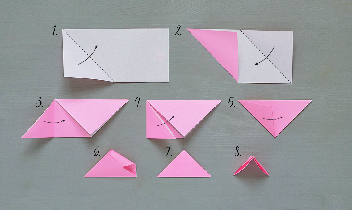 - ruota in senso antiorario e infila l’angolo destro dentro la tasca che si è formata (6), schiacciando bene lungo la piega fatta in precedenza