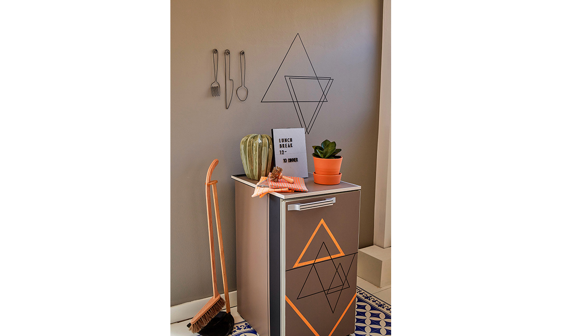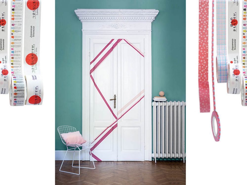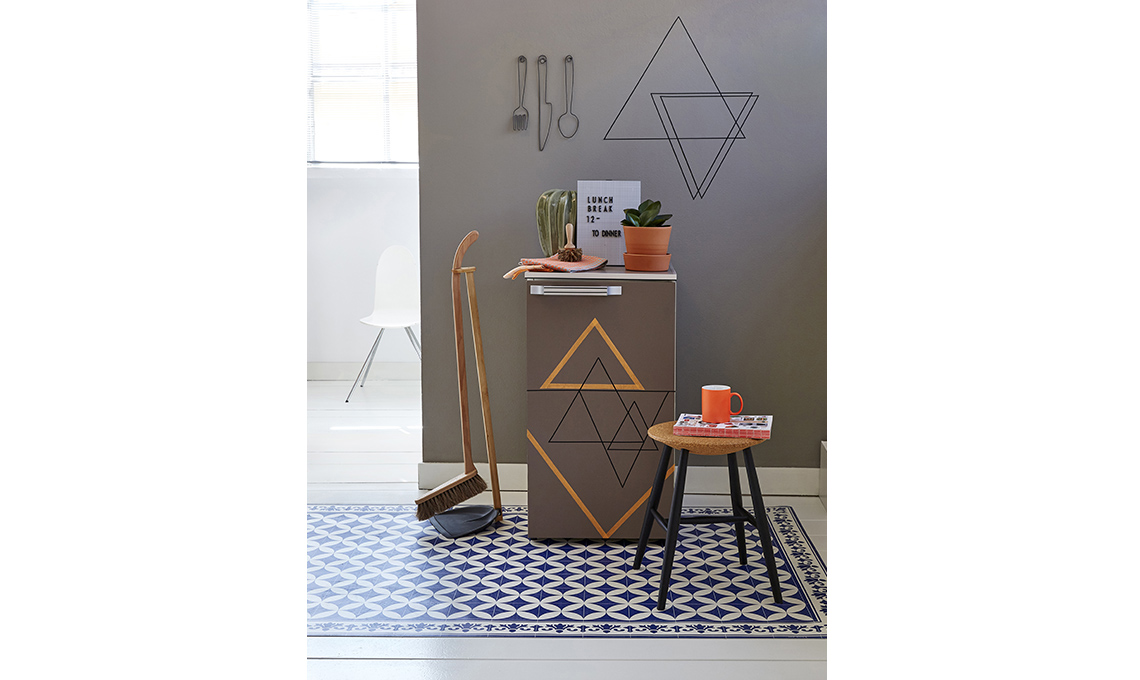 Con i washi tape realizza sull’anta e sui laterali delle geometrie e dei profili decorativi.