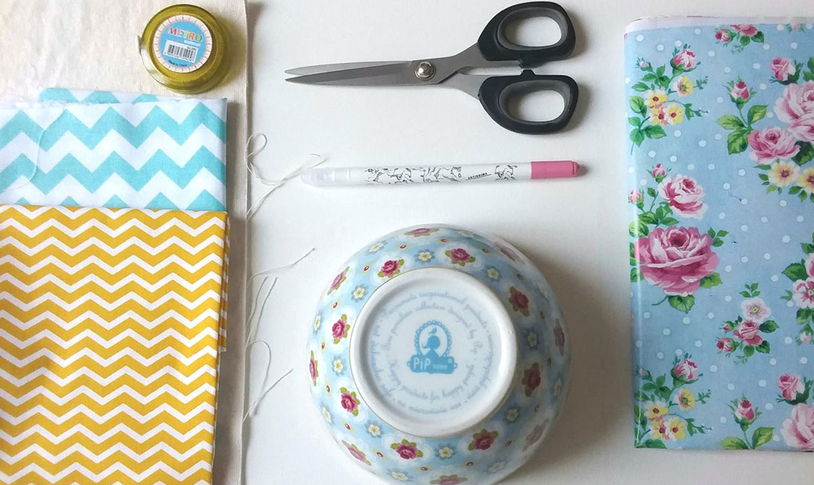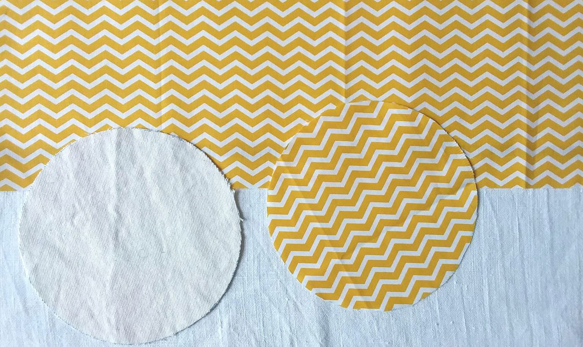 Prendete un pezzo di tessuto a tinta unita e uno a fantasia e, con l’aiuto di una ciotola, disegnate sul retro di ciascuno un cerchio. Ritagliate i due cerchi e misurate la circonferenza.