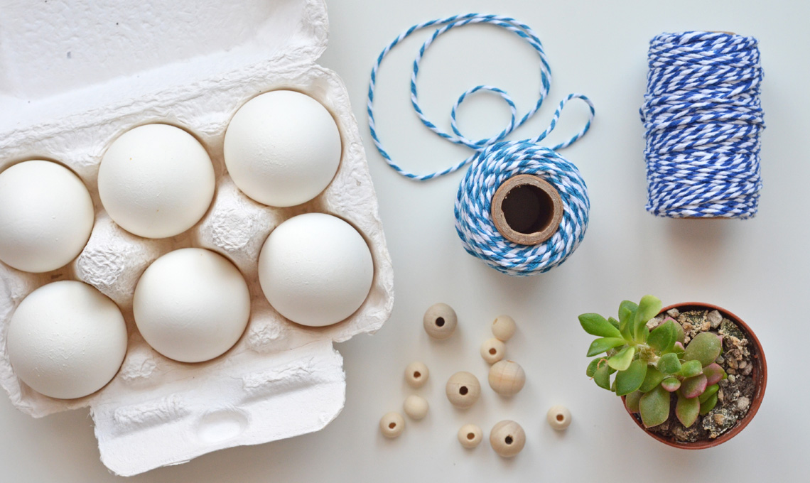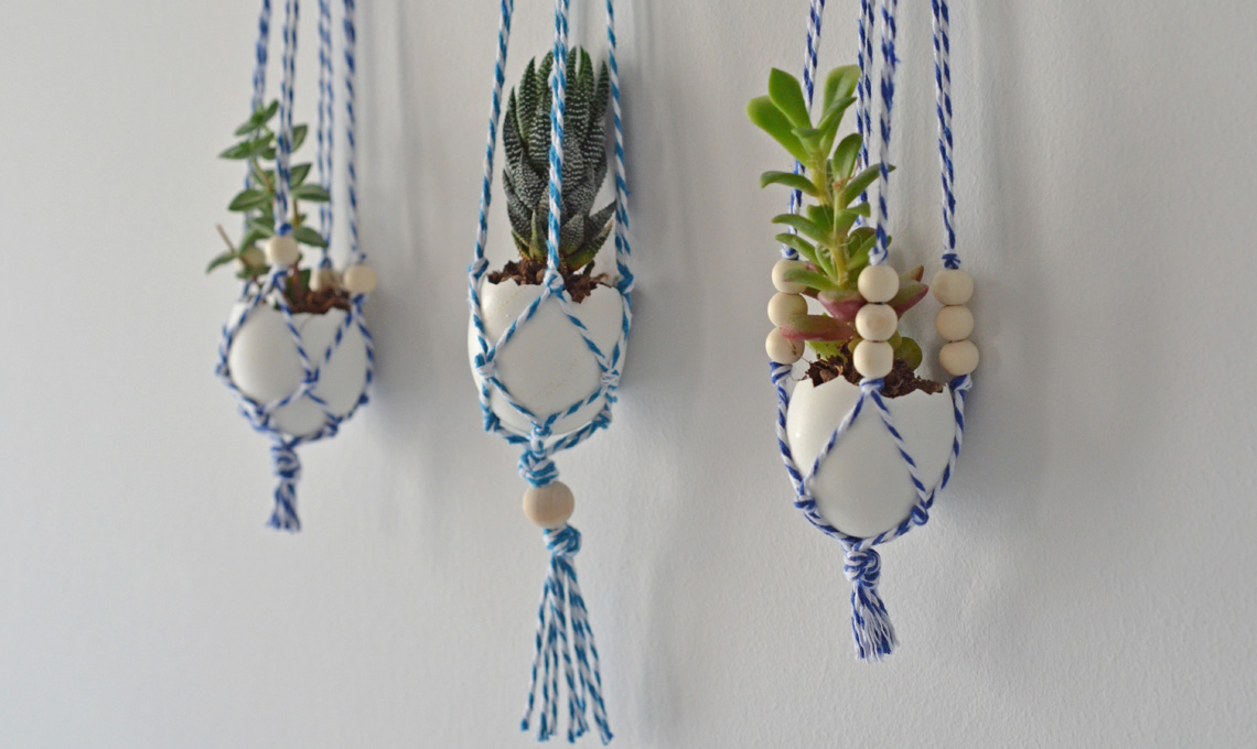 Le tradizionali uova di Pasqua decorate si trasformano con un tocco green e diventano minuscoli vasi sospesi, grazie alla struttura in spago annodato effetto macramè.
