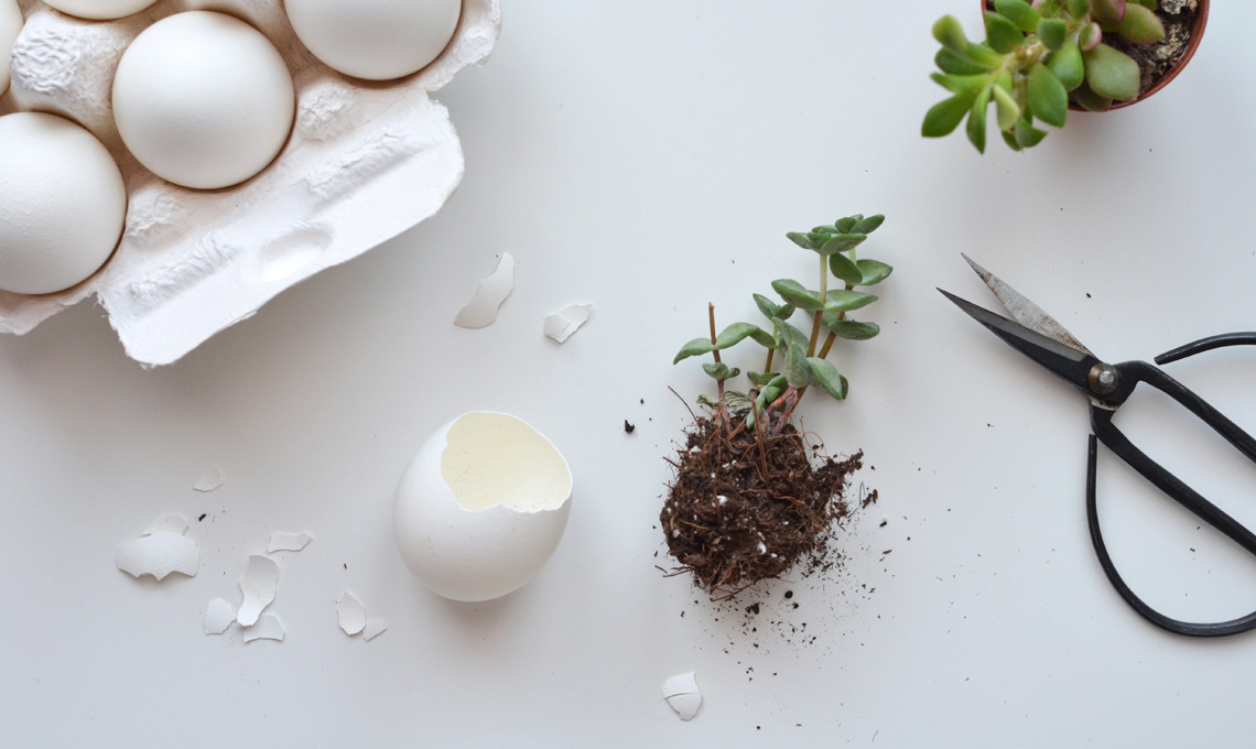 4. Rompi con le mani il guscio dell’uovo e inserisci all’interno la zolla di terra con la piantina.