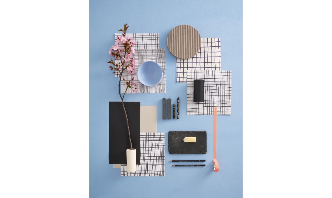 Moon in legno di betulla azzurro di [Normann Copenhagen] e sottopentola in pietra Groove Trivet di [Muuto], entrambi