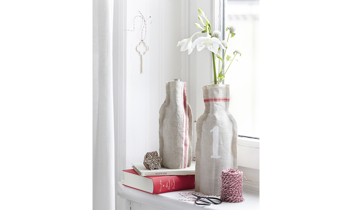 I vecchi teli di lino e i canovacci da cucina si trasformano in vasi fai-da-te in stile shabby. Usali per 'vestire' delle semplici bottiglie di vetro e trasformarle in decorazioni per la casa.