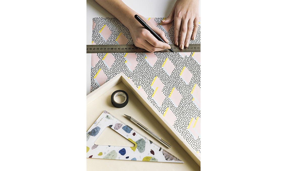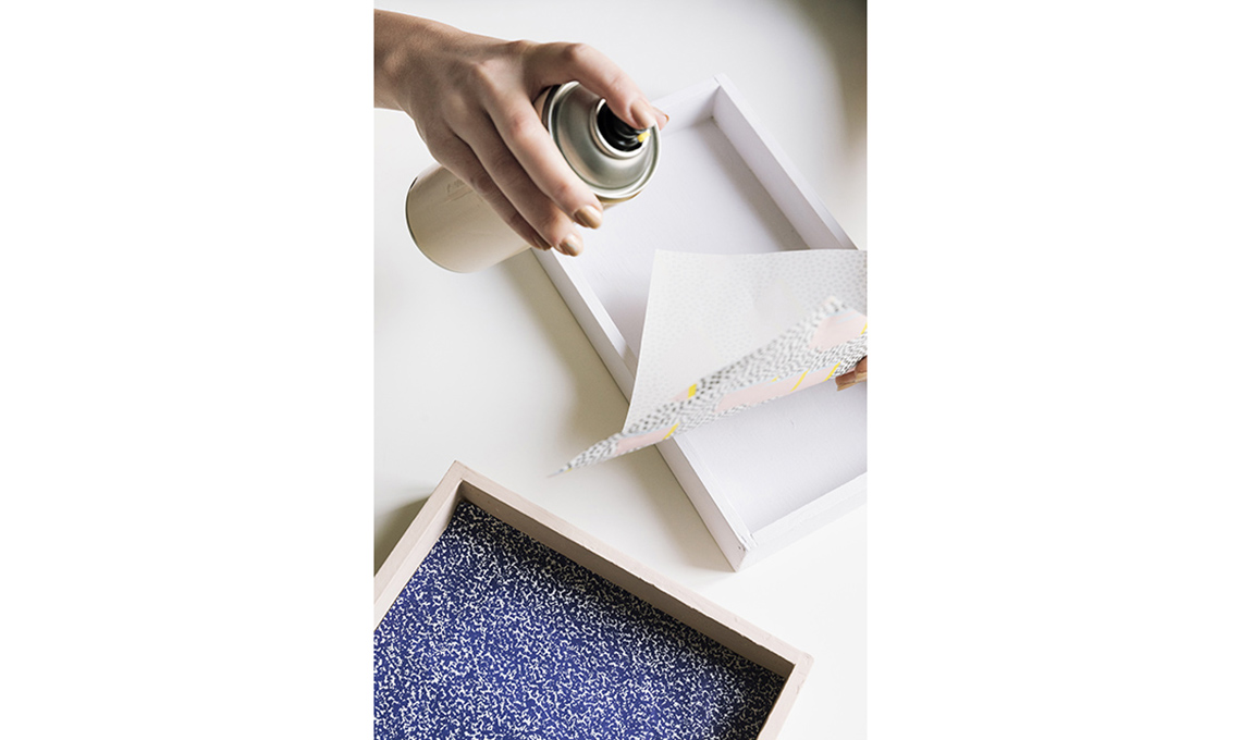 Ritaglia la carta a misura e incollala con la colla spray sulla base della scatola-vassoio.