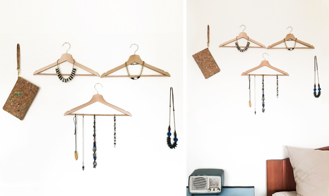 Se non hai paura di bucare le pareti, poi, puoi aggiungere all’insieme anche un paio di accessori, come una piccola trousse e una collana etnica. Io li ho scelti in legno e sughero, perché trovo che i materiali naturali rendano il tutto più caldo, ma in generale il mio consiglio è di selezionare ed esporre gli elementi che ami di più.