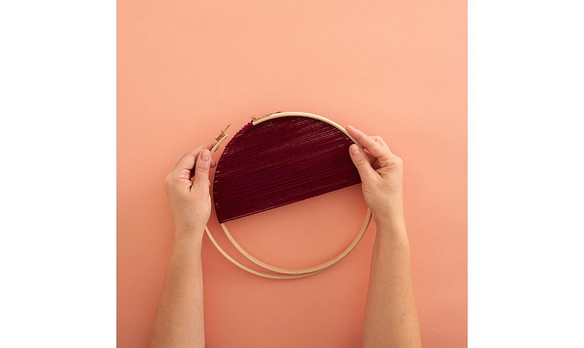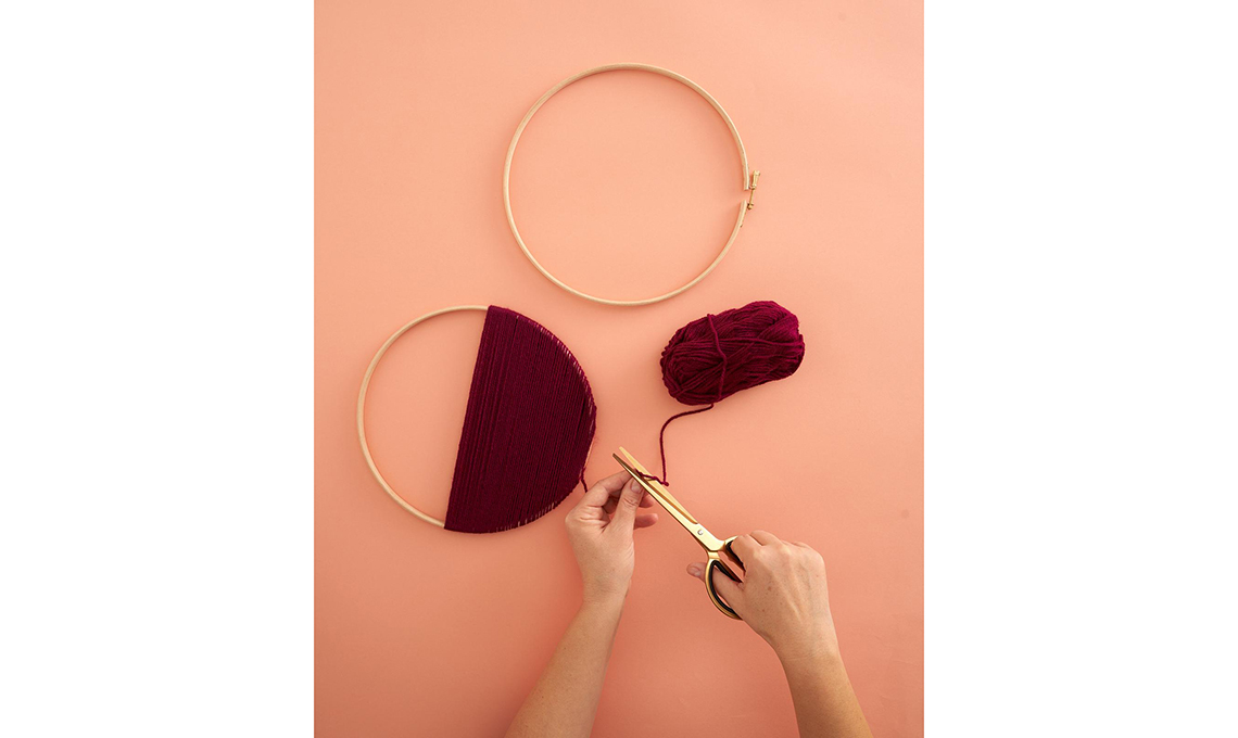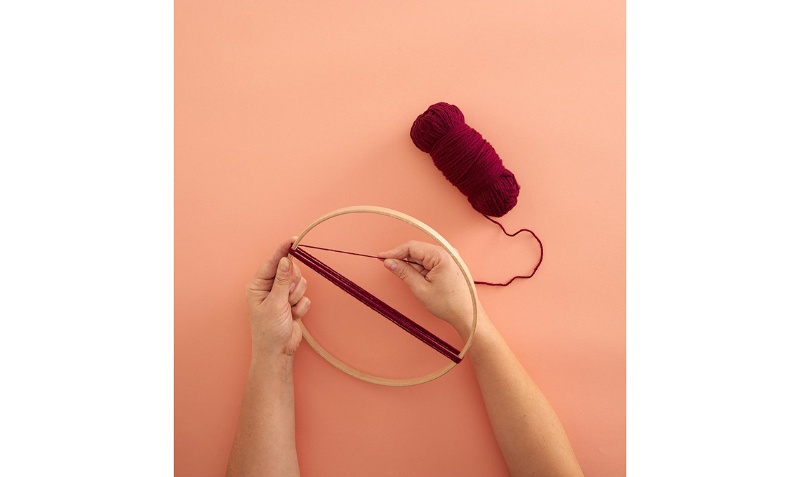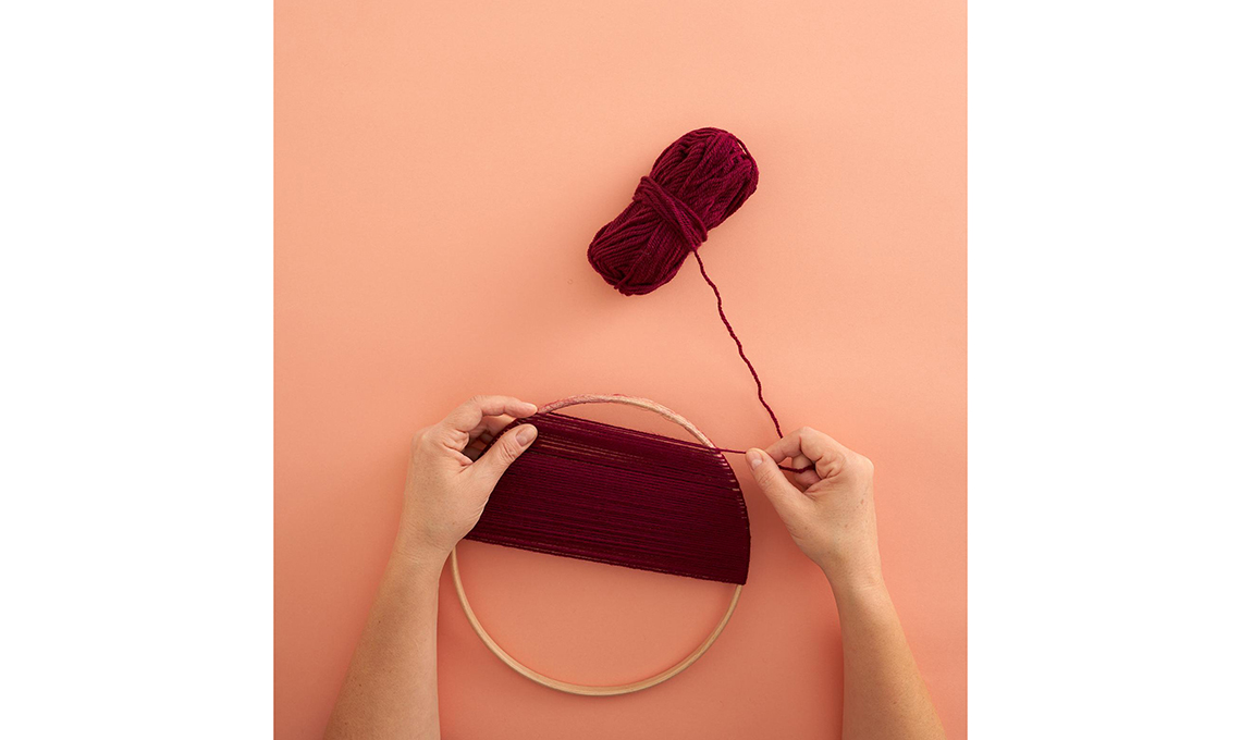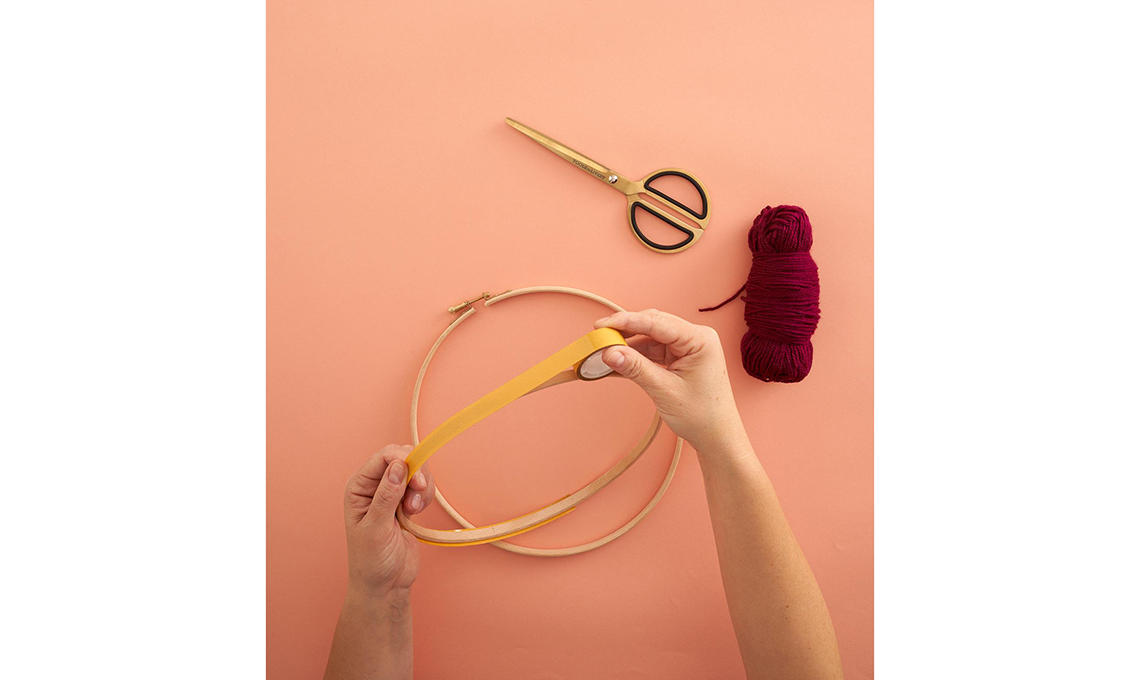 Annoda l’estremità della lana al cerchio, quindi avvolgila sul biadesivo, con giri stretti.