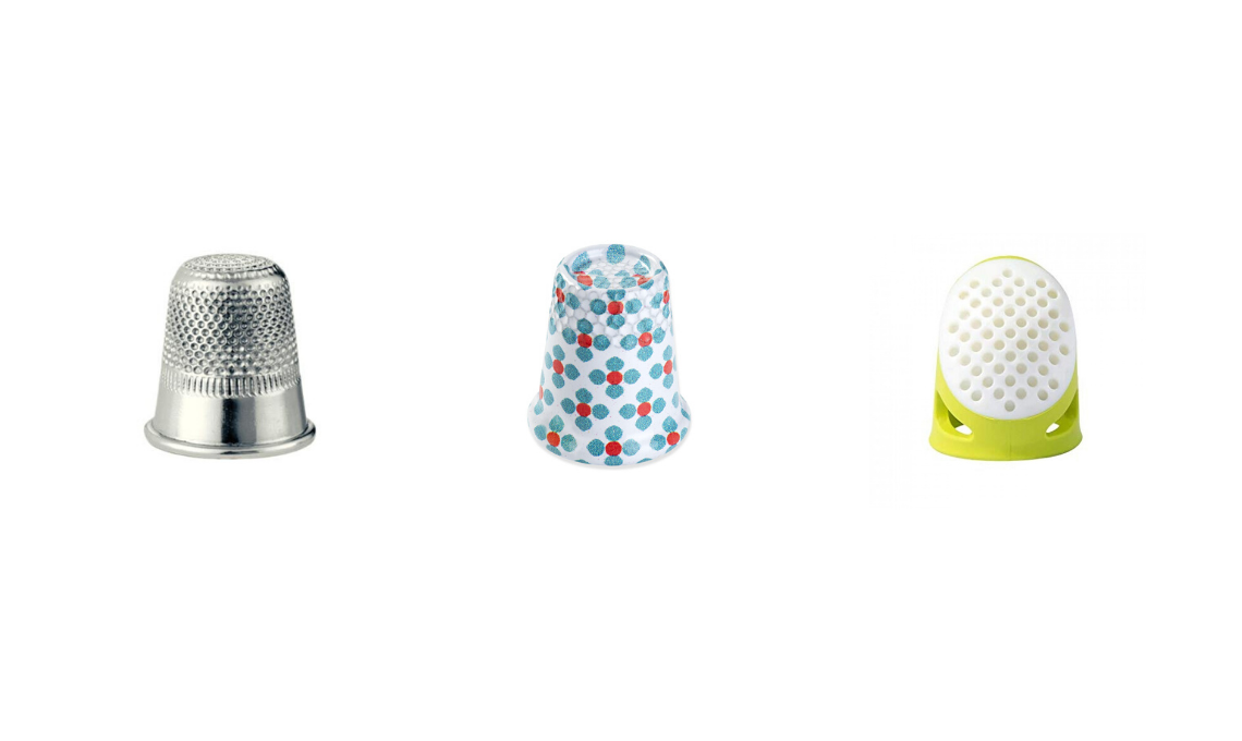 Ditale in acciaio [€1,60]; Ditale in acciaio a fantasia con spigolo antiscivolo [€4,80], Ditale “Soft Comfort” in plastica con diversi colori a seconda della taglia [€4,80] [Tutto Prym].