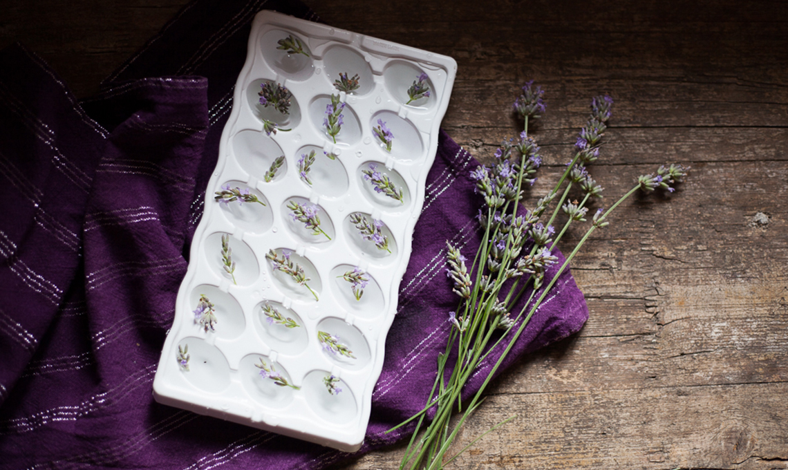 - Distribuisci nello stampo per cubetti di ghiaccio una manciata di fiori freschi di Lavanda e aggiungi dell'acqua.