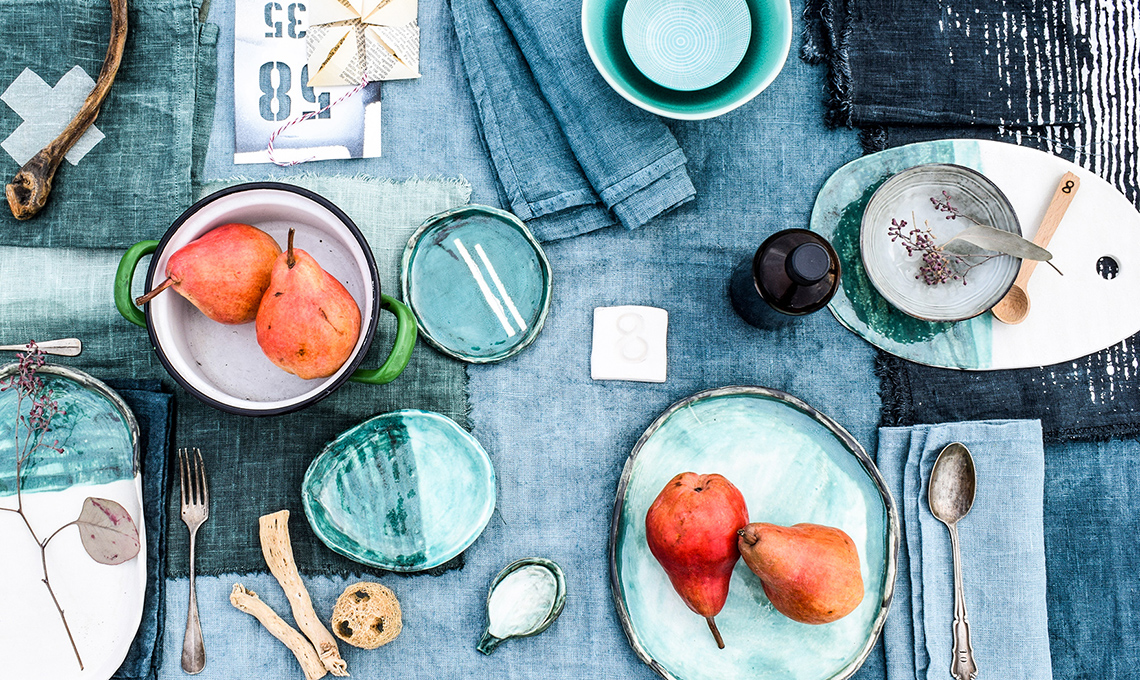 Una tavola che richiama il mare gioca di blu e azzurri, di chiari e di scuri: i tovaglioli hanno gradazioni diverse, tranne un unico pezzo in pendant con la tovaglia. Il rosso delle pere fa contrasto e ora tutto risalta!