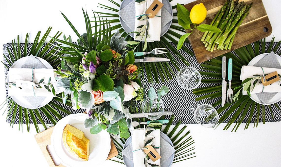 - Invece dei soliti sottopiatti, utilizza del verde, come le foglie di palma che portano subito il clima outdoor in tavola. Se le compri dal fioraio basterà poi adattarle con delle forbici, per pareggiare la lunghezza delle foglie in base alla dimensione dei tuoi piatti. Ti consiglio di non fartelo fare direttamente dal fioraio, di farlo personalmente a casa per non sbagliare la misura!