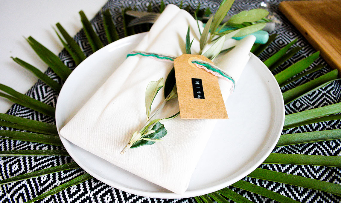 - Segnaposti originali fai da te. Potresti realizzarli con dei cartellini in carta craft e dei rametti di ulivo per fermarli con dei fili di cotone colorati. Scrivi poi i nomi dei tuoi invitati con una calligrafia elegante, oppure usa delle etichette nere stampate con la Dymo.