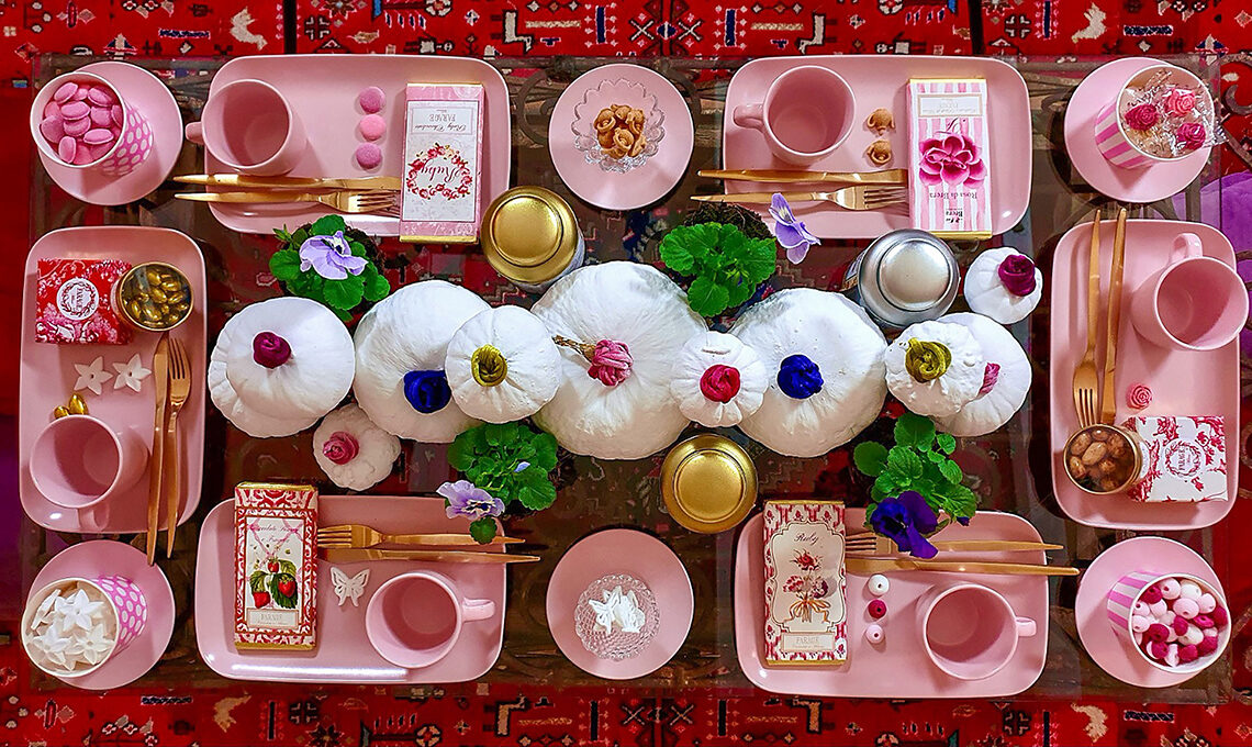 Una delle cose che ci piacciono delle tavole che Marianna De Gregorio condivide sul suo profilo Instagramè l’uso che fa del colore: «La differenza tra una mise en place anonima e una che cattura il cuore regalandoti un’emozione risiede nel suo carattere. E il colore è il mezzo più immediato per esprimerlo: è linguaggio, materia e non dettaglio» dice. Nel suo tè delle 5, allestito su un tavolino, ogni commensale ha a disposizione una ciotolina con piccole sculture di zucchero. Le zucche? Sono vere, ridipinte di bianco e decorate con un ‘tuppo’ di velluto.