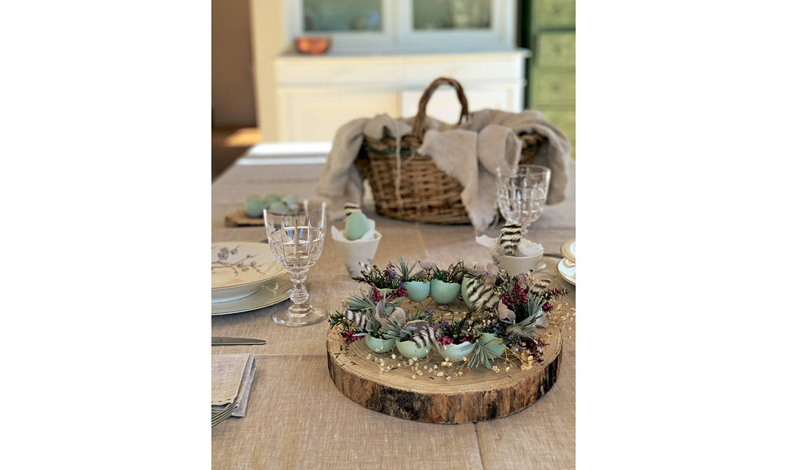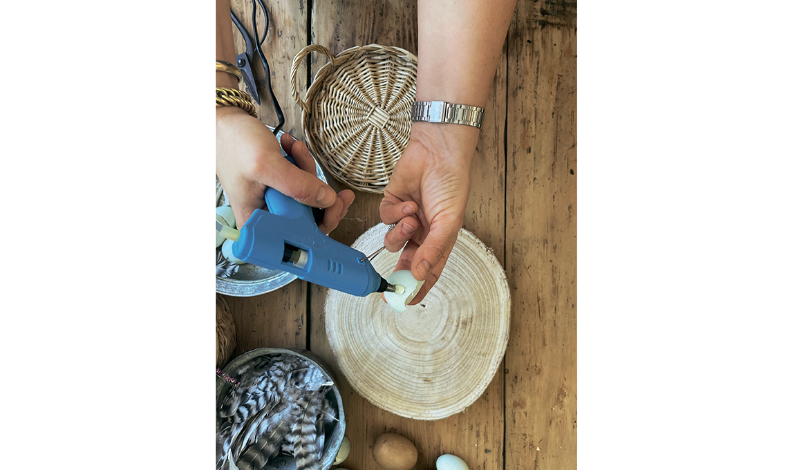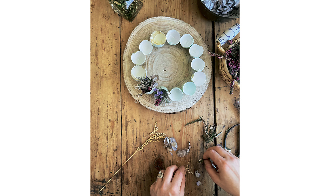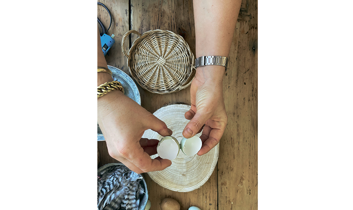 - Dopo aver unito i gusci, trasferisci il cerchio di uova sulla base di legno (in alternativa usa un piatto o un’alzatina).