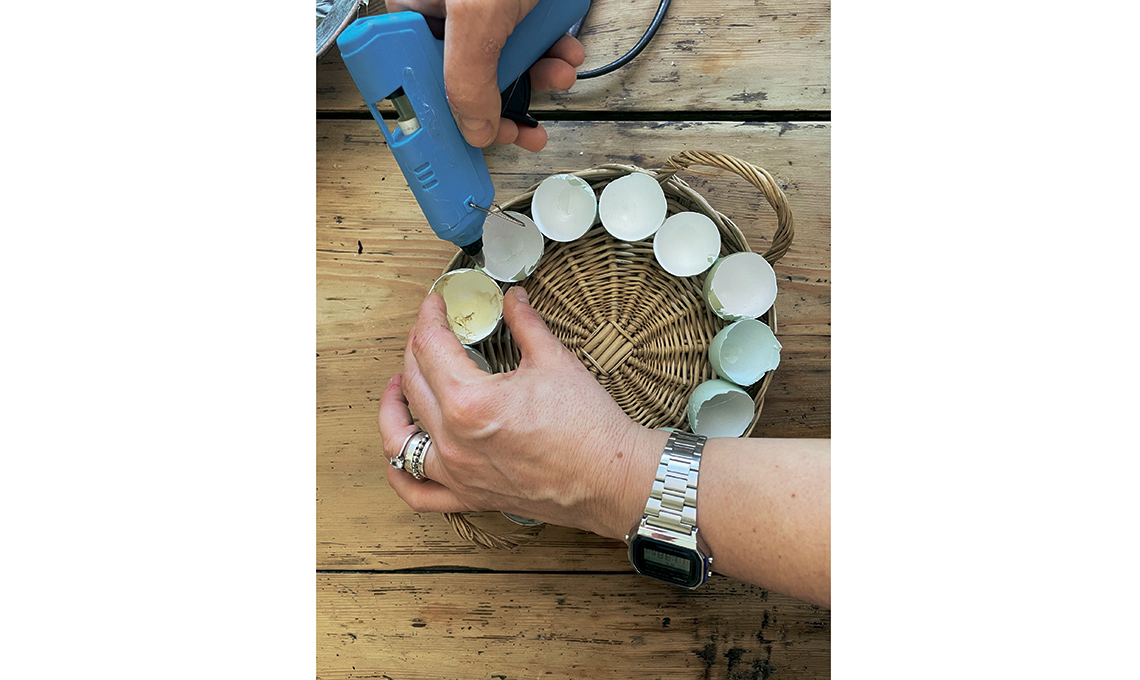- Dopo aver lavato e fatto asciugare i gusci di uova, incisi pressoché a metà altezza, incollali tra loro sui lati con una punta di colla a caldo.